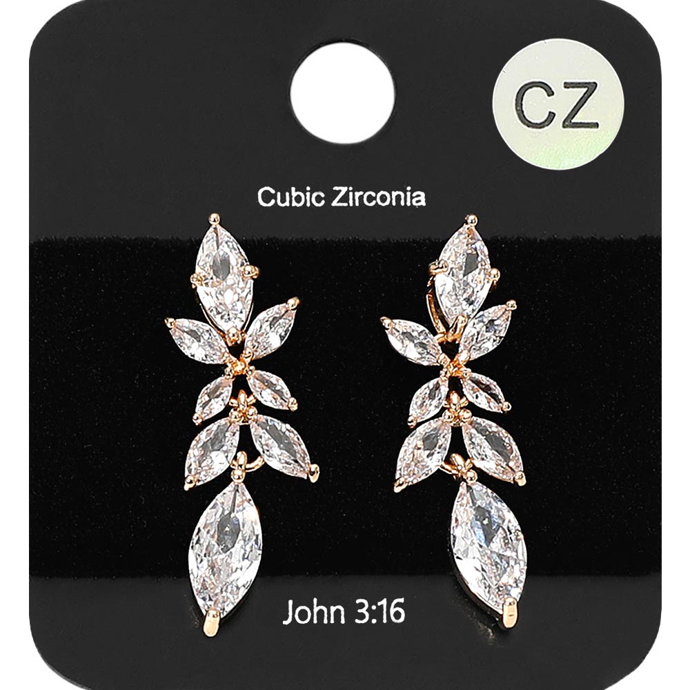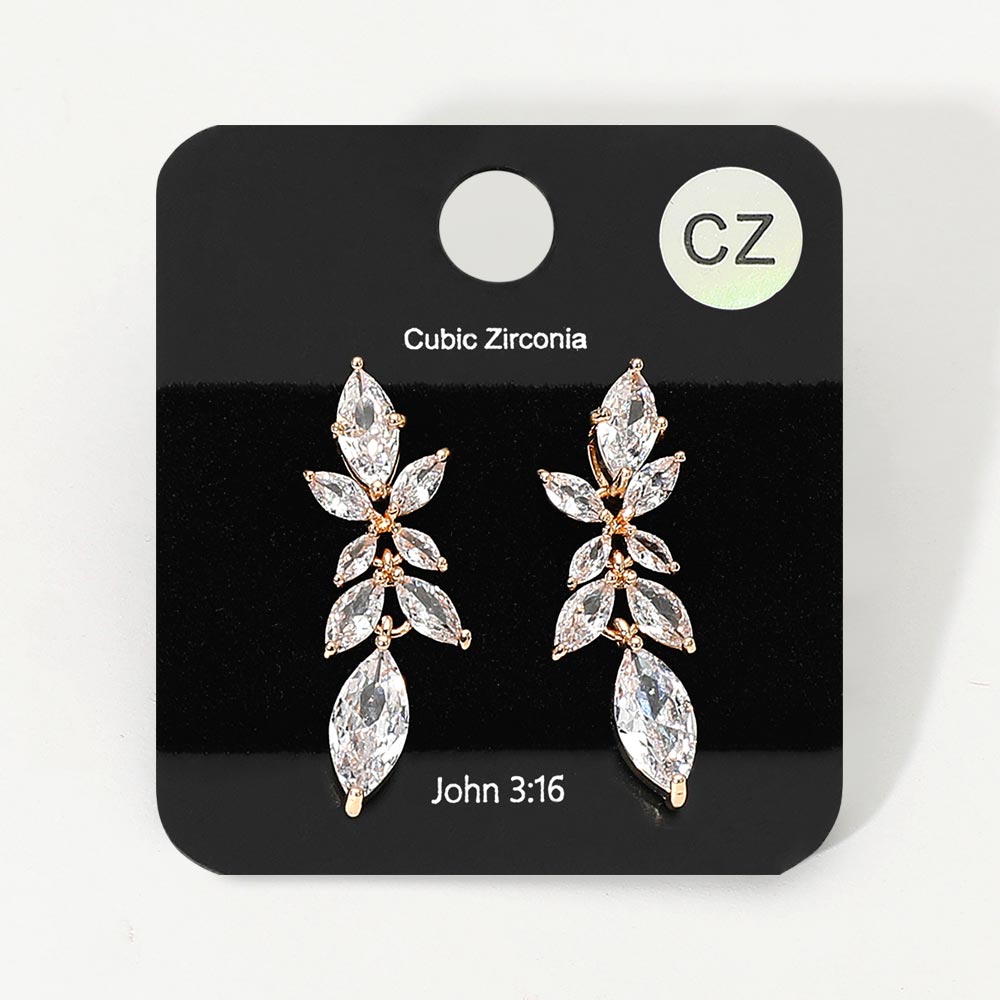 • These marquise leaf cubic zirconia drop earrings exude elegance with their cascading leaf-inspired design. Each stone is cut to perfection, offering a brilliant sparkle that enhances both formal and evening looks, making them a refined accessory for any sophisticated occasion.