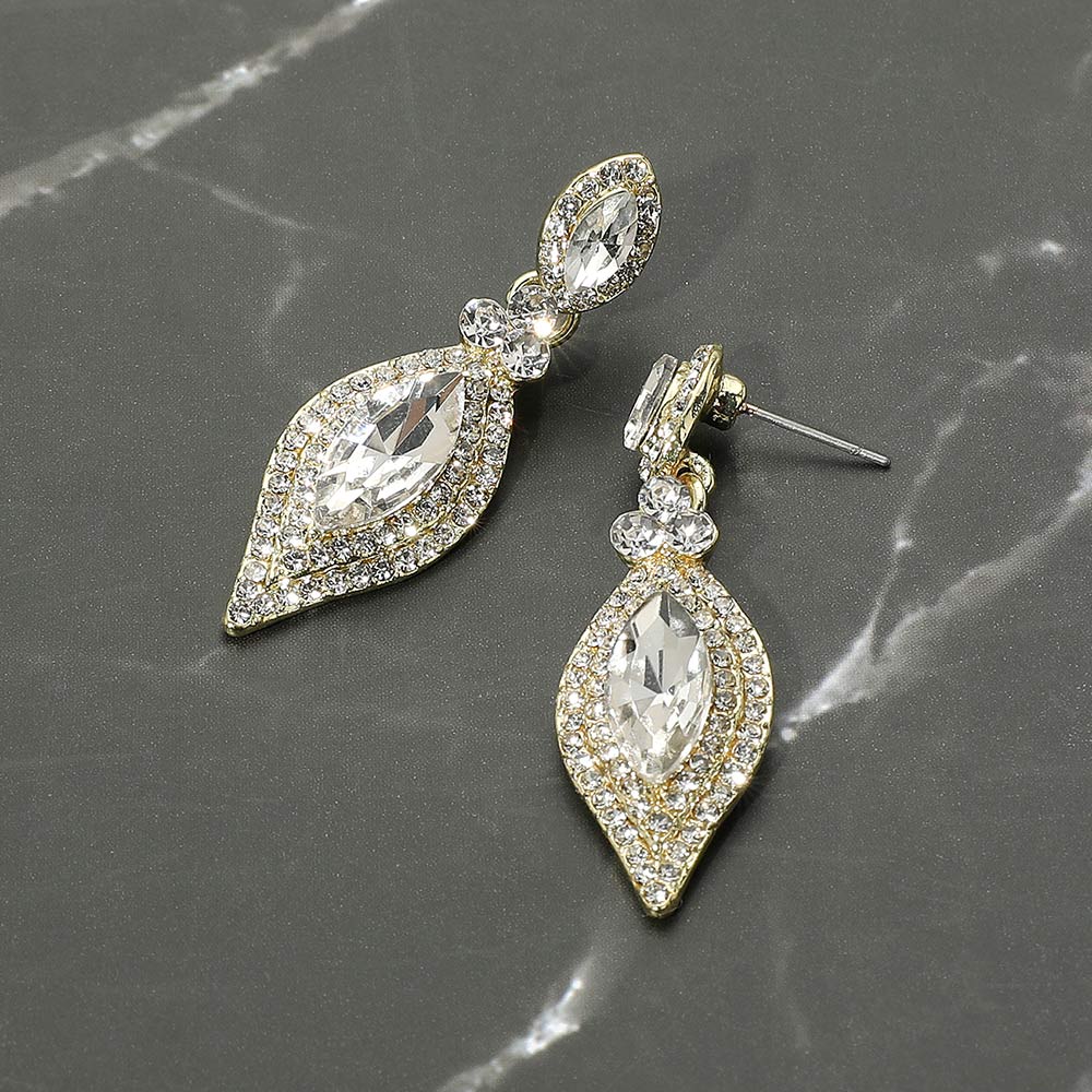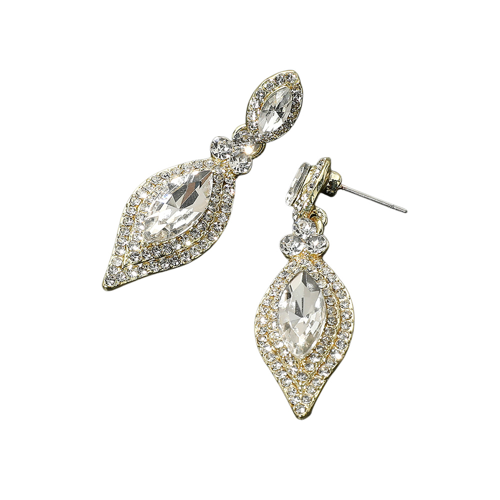 Details • Size : 0.6" X 1.9" • Post Back • Elegant marquise crystal drop earrings featuring a layered teardrop-inspired silhouette framed with sparkling stones. Their refined shape adds radiant shine, making them ideal for weddings, evening events, formal occasions, or elevating any look with a touch of sophisticated glamour.