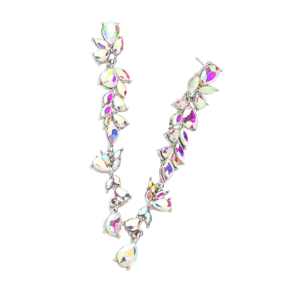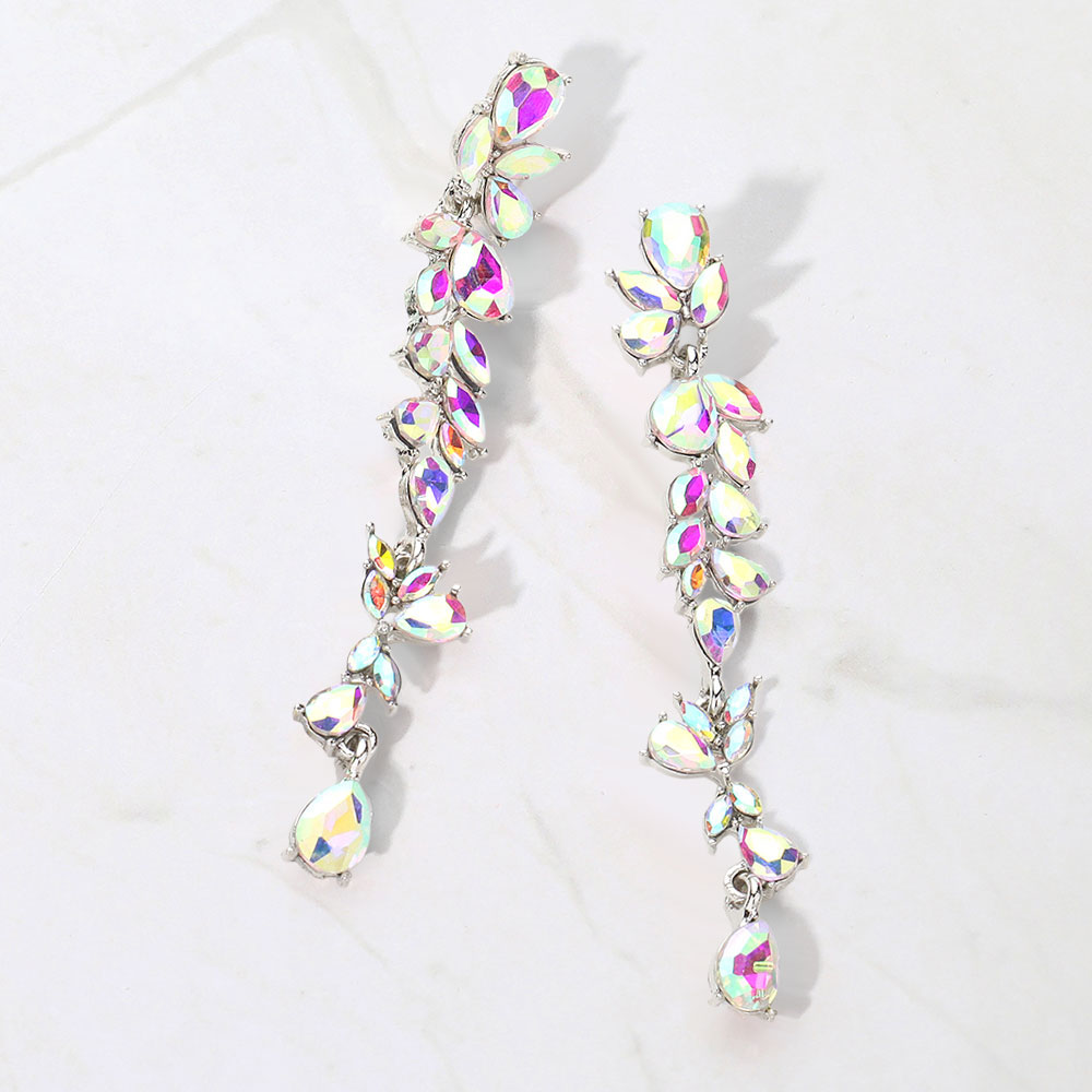 • These iridescent leaf drop earrings feature a cascading design of marquise and teardrop crystals that shimmer beautifully from every angle. Lightweight yet eye-catching, they bring a luminous touch to any outfit, making them ideal for special occasions or elegant evening wear.