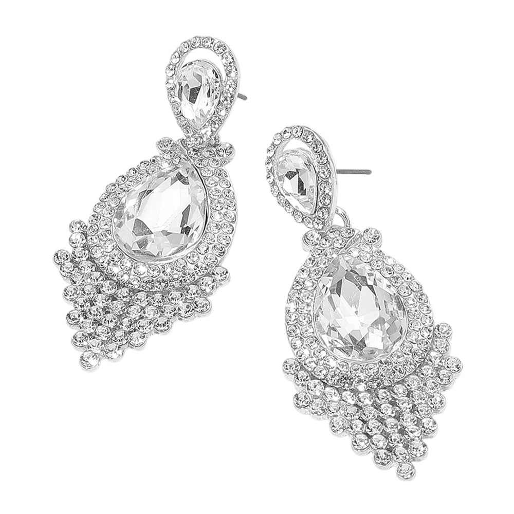 • Elegant teardrop dangle earrings with sparkling crystal embellishments and layered fringe design, ideal for weddings, parties, or glamorous evening events.