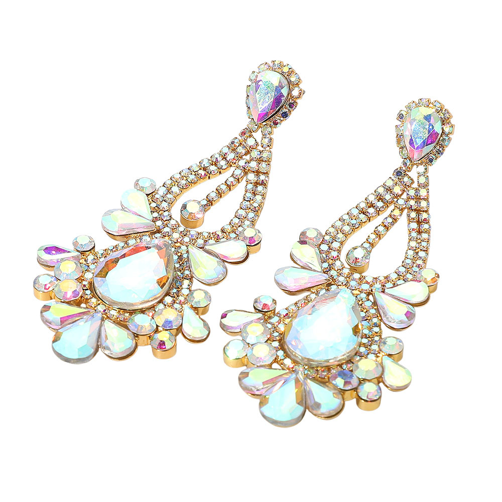 Details • Size : 1.5" X 3.1" • Post Back • Turn heads with these iridescent teardrop statement earrings, featuring a dazzling arrangement of shimmering stones and intricate detailing. Perfect for parties, weddings, and glamorous occasions, these earrings add a bold touch of sparkle and sophistication to any elegant look. • Lead and Nickel Compliant