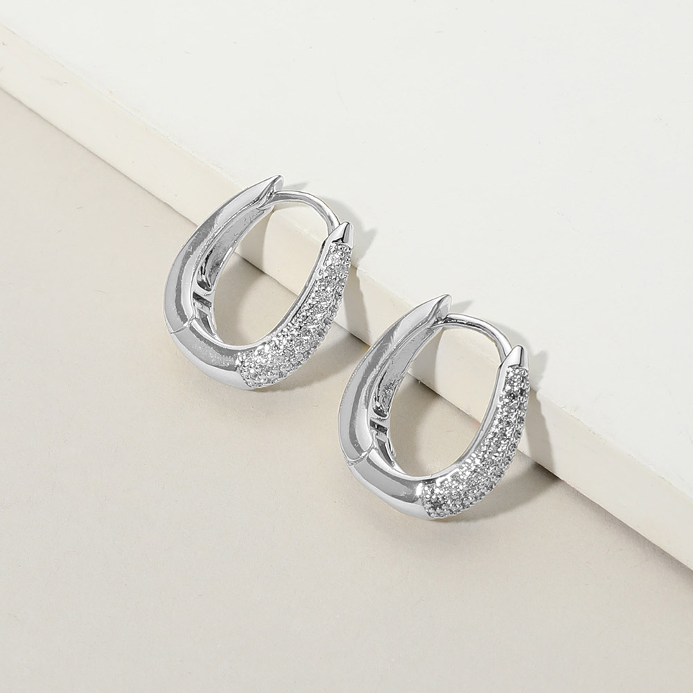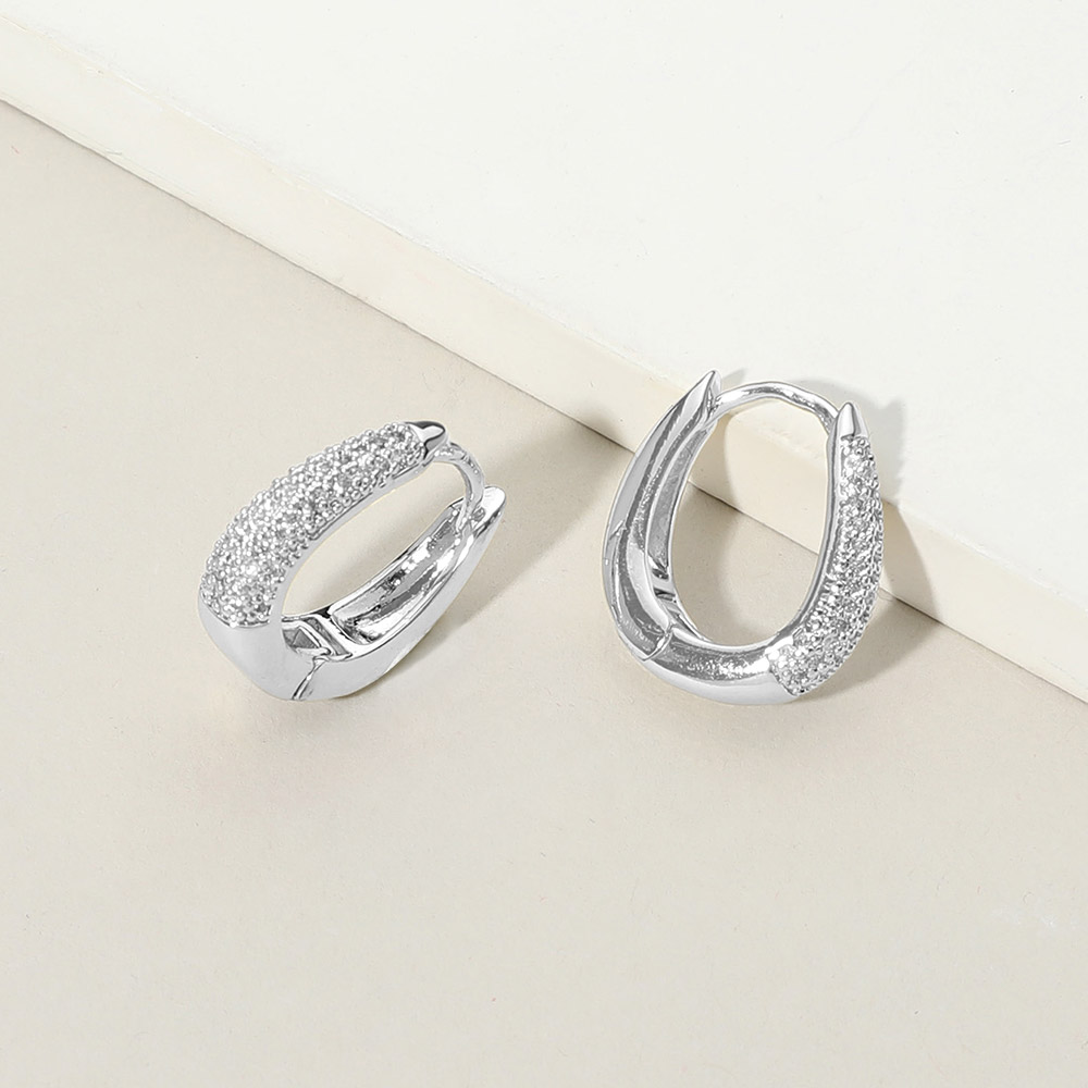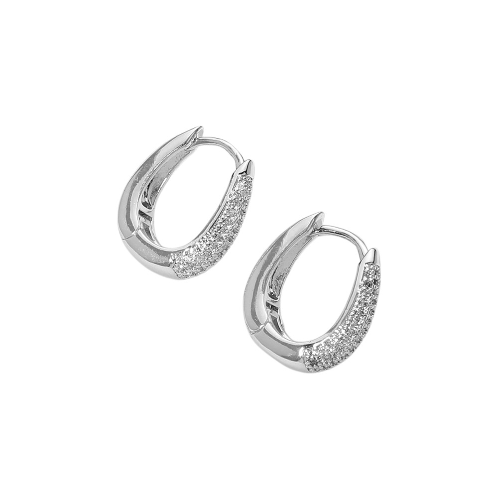 White Gold Dipped CZ Stone Paved Oval Huggie Hoop Earrings