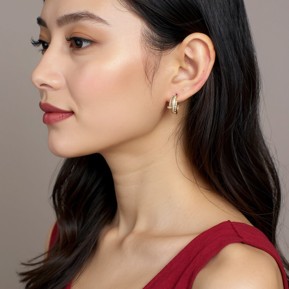 • These layered huggie hoop earrings shine with rows of pavĂ© crystals, creating a dimensional and modern stacked look. A chic blend of polish and sparkle, they’re the perfect versatile accessory for everyday wear, date nights, or occasions where subtle glamour is key.
