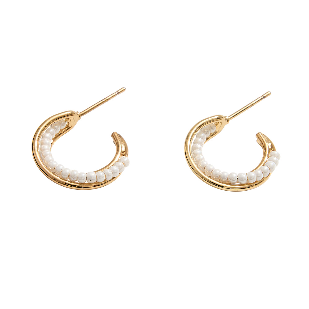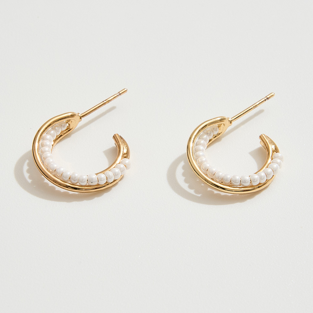 Details • Size : 0.7" X 0.7" • Post Back • These chic hoop earrings feature a sleek open hoop design accented with a row of delicate beads for a refined and modern touch. Perfect for everyday wear or special occasions, they offer a timeless balance of elegance and style to enhance any jewelry collection. • Brass • Gold Dipped • Hypoallergenic • Lead and Nickel Compliant • Made In Korea