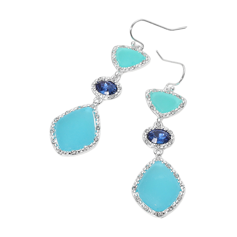 Details • Size : 0.75" X 2.5" • Fish Hook Back • These captivating triple gemstone dangle earrings feature shimmering stones in complementary tones, framed with delicate crystal detailing for extra brilliance. Lightweight and elegant, they bring a refreshing touch of sophistication to any outfit, from daywear to evening elegance. • Lead and Nickel Compliant