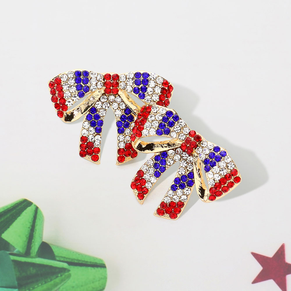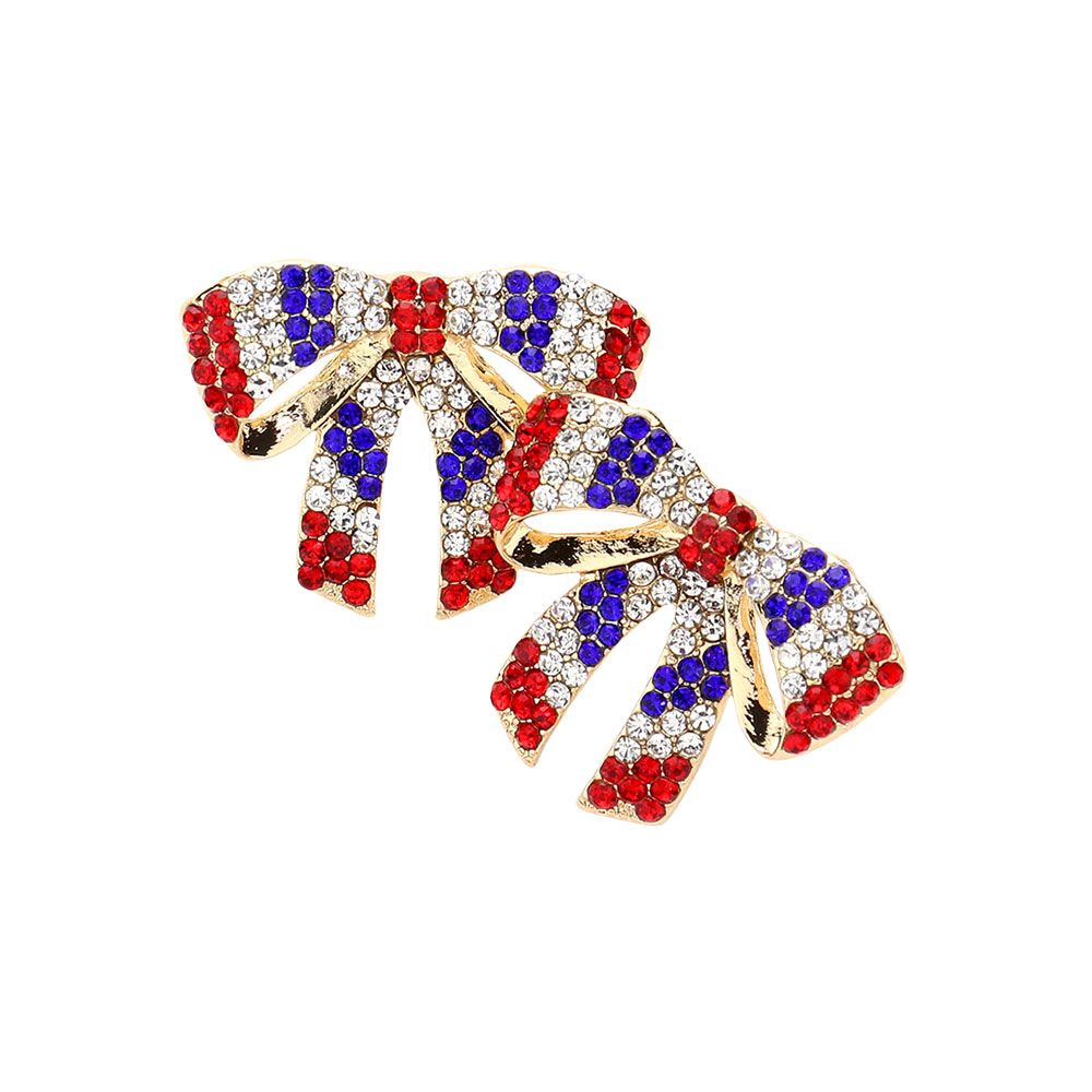 Details • Size : 1.3" X 1" • Post Back • Celebrate in style with these patriotic-inspired bow earrings, encrusted with shimmering rhinestones for a festive and eye-catching statement. Perfect for themed events, parties, or adding flair to any outfit with bold sparkle. • Lead and Nickel Compliant