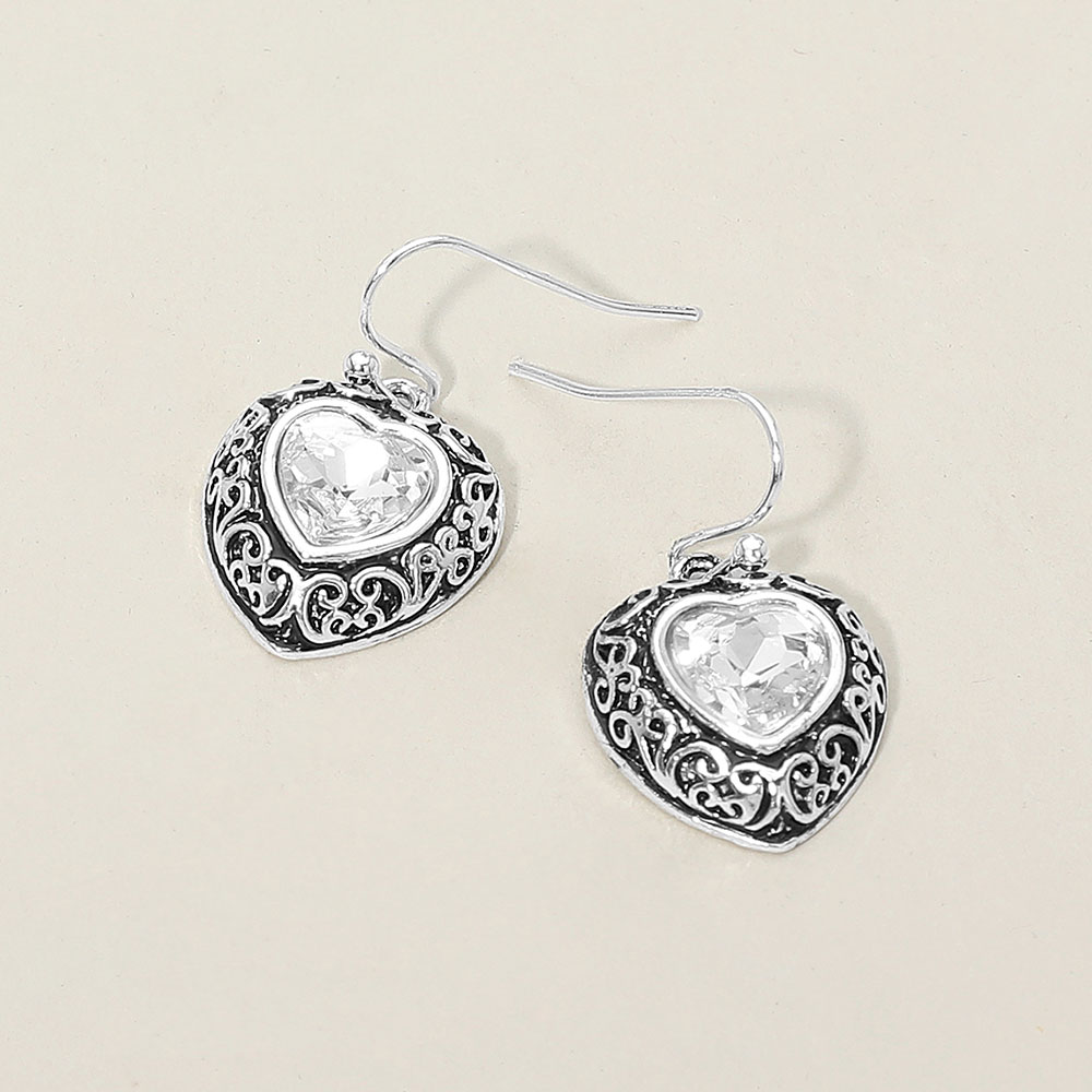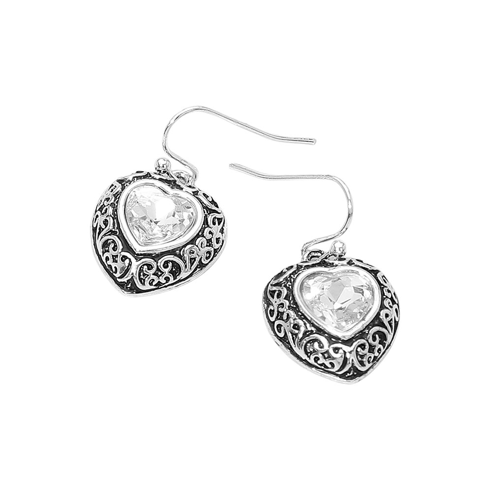 Details • Size : 0.6" X 1" • Fish Hook Back • Elevate your style with these heart drop earrings featuring an ornate framed setting and classic hook design for easy wear. Perfect for daily outfits or evening looks, they add a romantic sparkle and graceful movement while delivering lightweight comfort and versatile elegance. • Lead and Nickel Compliant