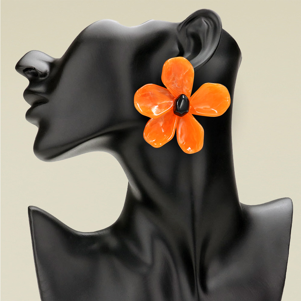 Details • Size : 2.5" X 2.5" • Post Back • Bold statement earrings featuring large petal-shaped floral design with glossy finish. Perfect for elevating any outfit, these eye-catching earrings add a touch of artistic flair and elegance, ideal for special occasions, photoshoots, or standout fashion looks. • Lead and Nickel Compliant