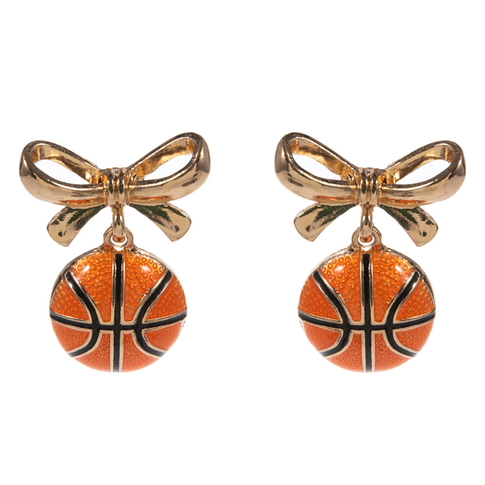 Details • Size : 0.8" X 1.1" • Titanium Post Back • Add playful charm to your game-day outfit with these glitter basketball drop earrings. Featuring a cute bow detail, they’re perfect for tailgates, sports events, or showing team spirit in a fun and stylish way. • Lead and Nickel Compliant • Hypoallergenic