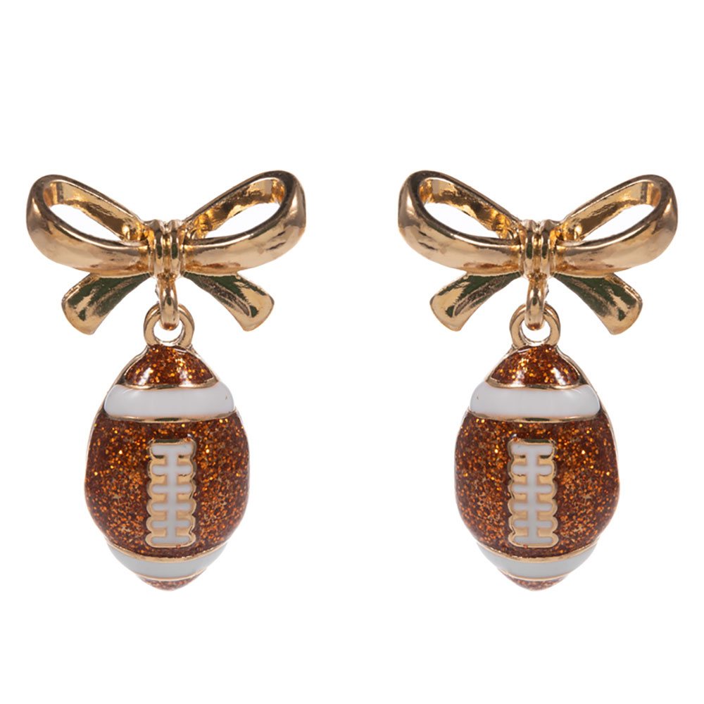 Details • Size : 0.8" X 1.25" • Titanium Post Back • Add playful charm to your game-day outfit with these glitter football drop earrings. Featuring a cute bow detail, they’re perfect for tailgates, sports events, or showing team spirit in a fun and stylish way. • Lead and Nickel Compliant • Hypoallergenic