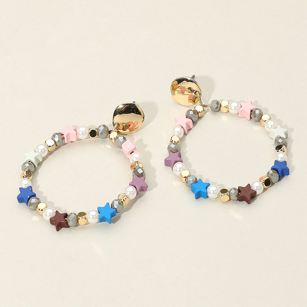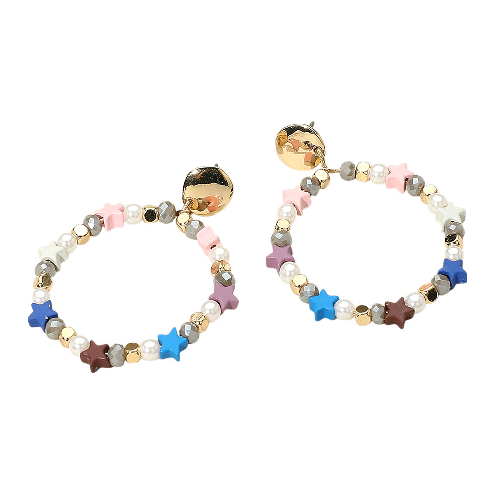 Details • Size : 1.5" X 2" • Post Back • Brighten your look with playful star beaded hoop earrings featuring multicolor accents and metallic details. Fun and trendy, these lightweight hoops add a cheerful pop of personality, perfect for casual outfits, festivals, or playful everyday style. • Lead and Nickel Compliant