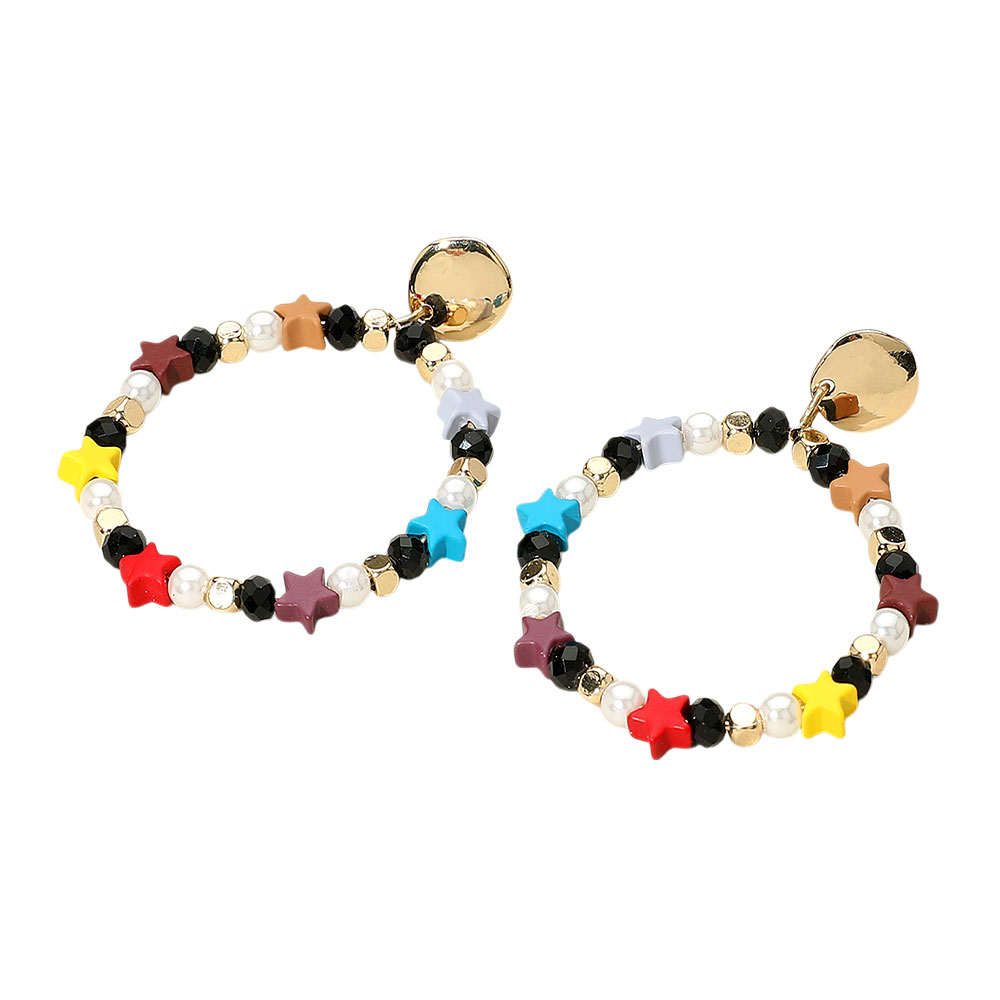 Details • Size : 1.5" X 2" • Post Back • Brighten your look with playful star beaded hoop earrings featuring multicolor accents and metallic details. Fun and trendy, these lightweight hoops add a cheerful pop of personality, perfect for casual outfits, festivals, or playful everyday style. • Lead and Nickel Compliant