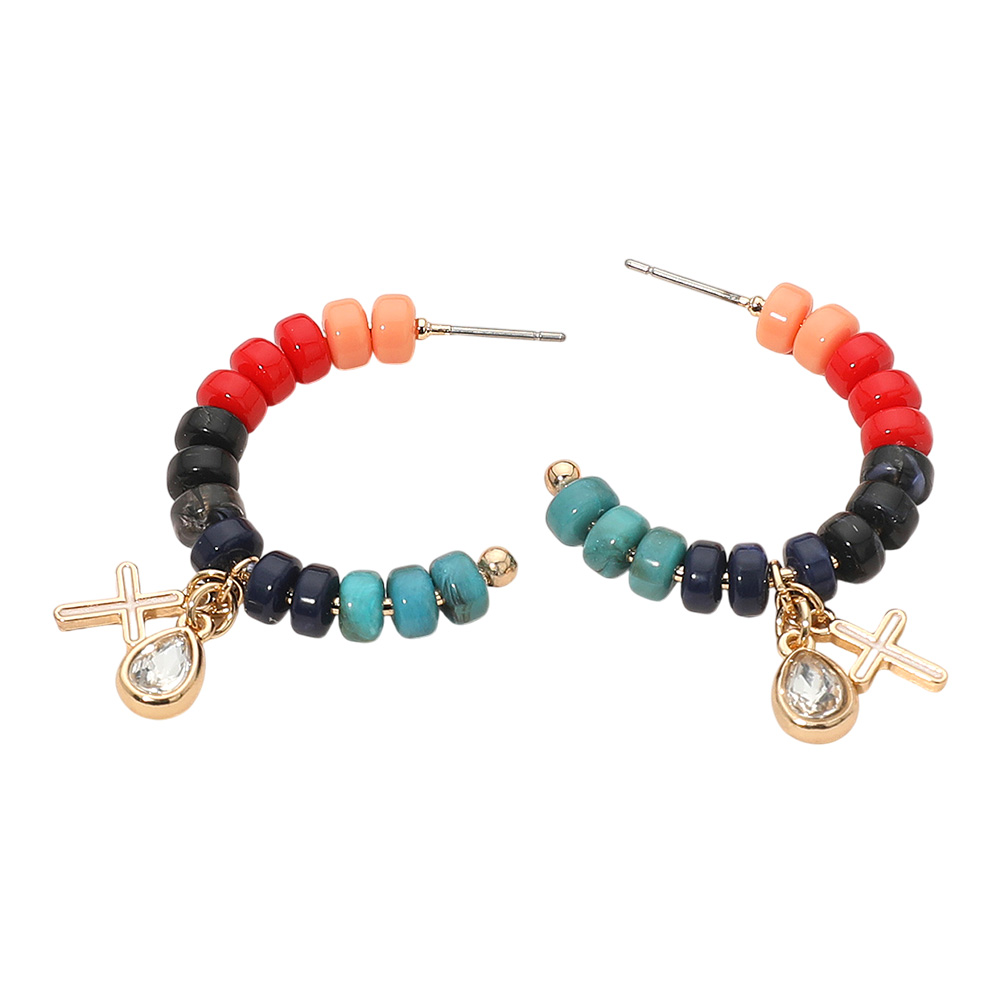 Details • Size : 1.25" X 1.6" • Post Back • Stylish beaded hoop earrings accented with cross and crystal charms for a trendy, boho-inspired look. Lightweight and unique, these hoops add personality to any outfit, making them perfect for festivals, casual days, or statement accessory lovers. • Lead and Nickel Compliant