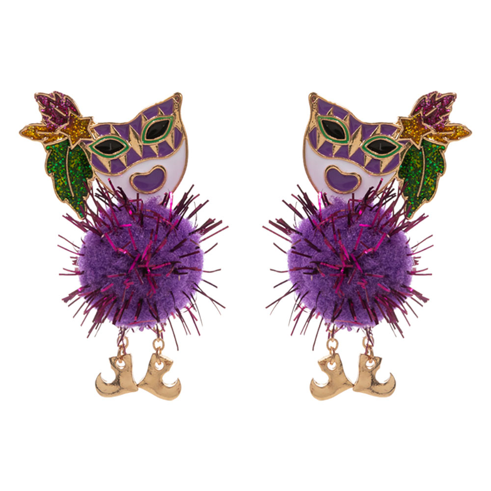 Details • Size : 1" X 2" • Titanium Post Back • Bring the celebration to life with these Mardi Gras Mask Pom Pom Earrings. Featuring vibrant mask charms, fuzzy pom accents, and festive details, they add playful elegance to any parade or themed event, perfect for capturing the joy of carnival season. • Hypoallergenic • Lead and Nickel Compliant