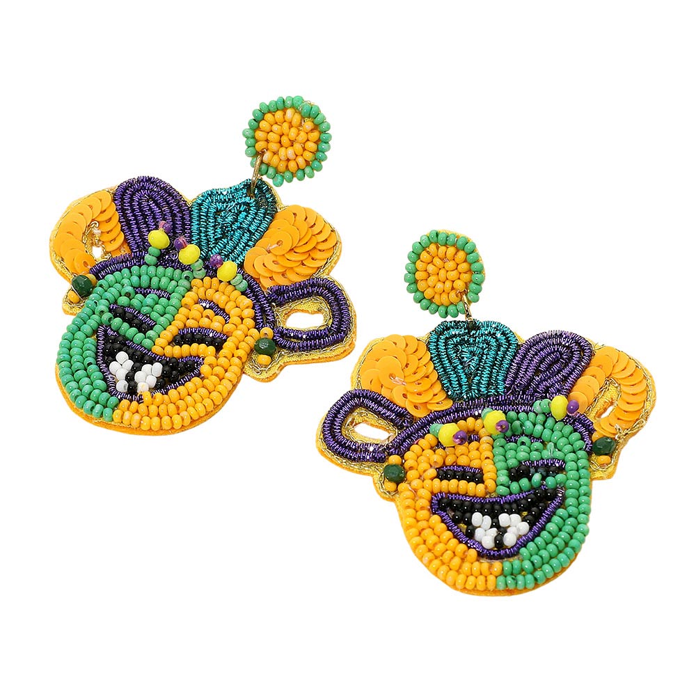 Details • Size : 2.25" X 2.5" • Post Back • Vibrant statement earrings showcasing an expressive mask motif with intricate beaded detailing for eye-catching impact. Designed to feel lightweight while delivering bold style, these earrings are ideal for parties, festivals, themed looks, and standout everyday outfits. • Lead and Nickel Compliant • Made In India