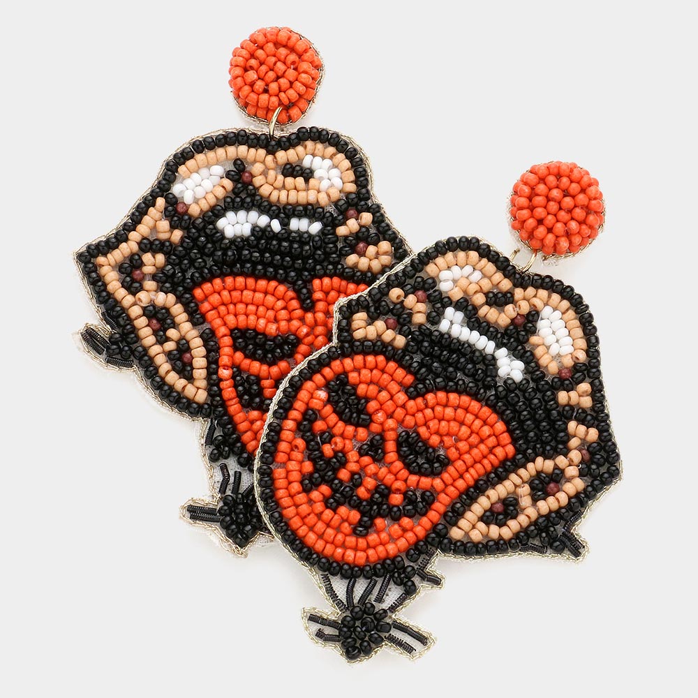 Felt Back Seed Beaded Tongue Out of Mouth Spider Dangle Earrings