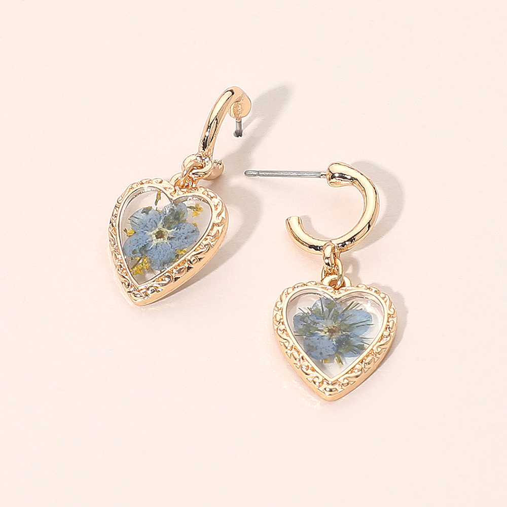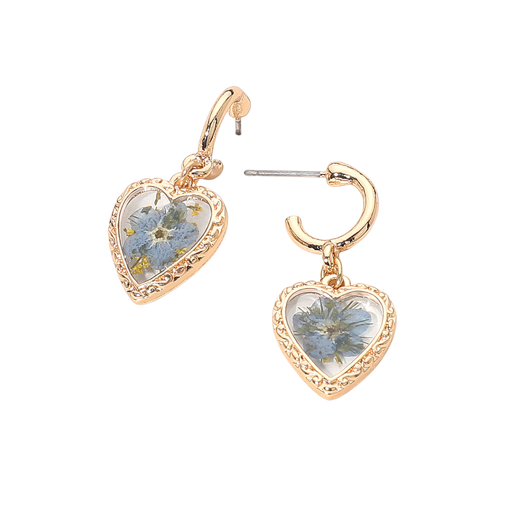 Details • Size : 0.6" X 1.3" • Fish Hook Back • Charming heart-shaped drop earrings designed to showcase a delicate, botanical-inspired centerpiece within a sleek, modern silhouette. Lightweight and easy to style, they add a romantic accent to everyday outfits while transitioning effortlessly into polished looks for evenings or special occasions. • Lead and Nickel Compliant