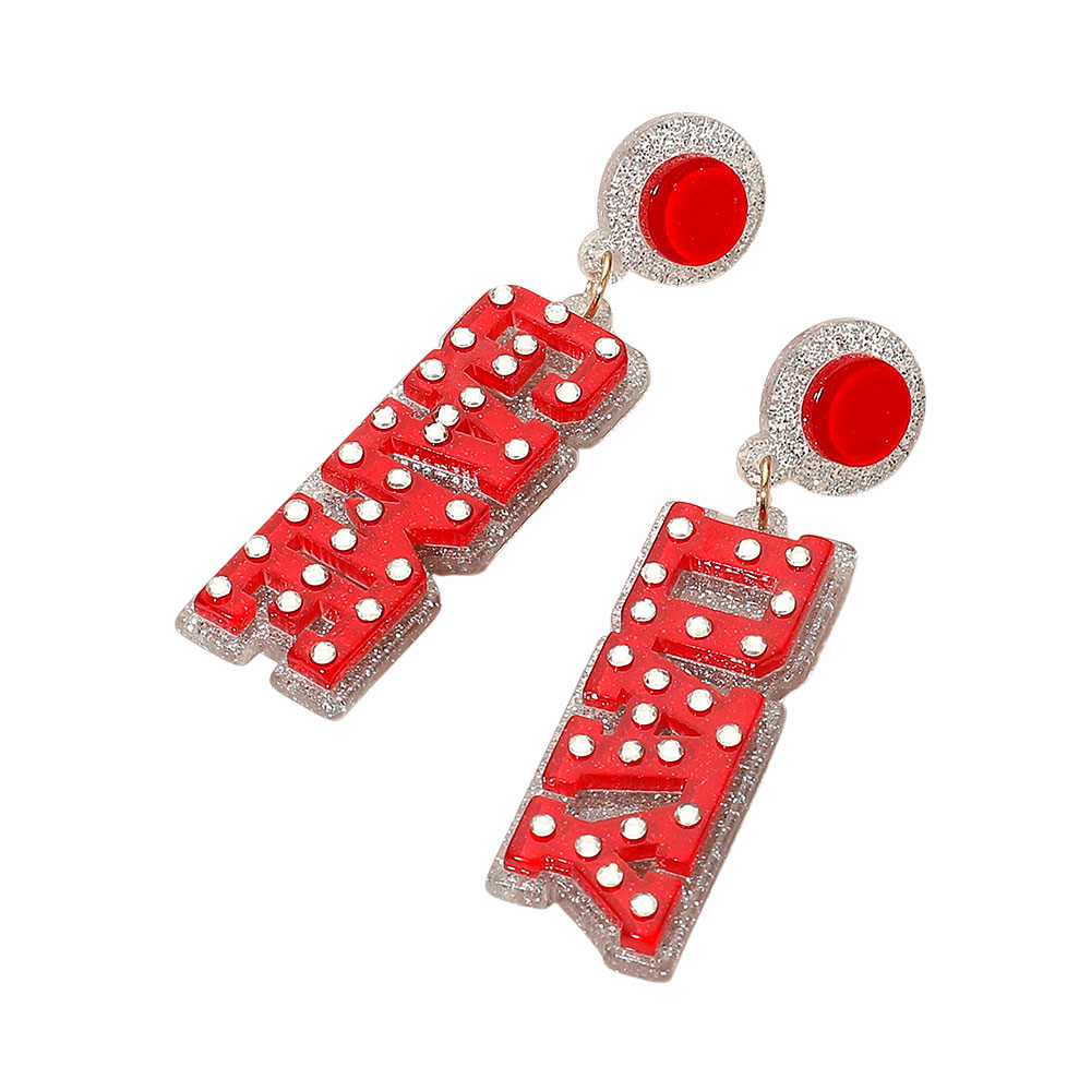 Details • Size : 0.6" X 2.5" • Post Back • Statement drop earrings designed with bold letter charms and sparkling details for a spirited look. Lightweight and eye-catching, these earrings are the perfect accessory to show team pride and add playful energy to game day outfits. • Lead and Nickel Compliant