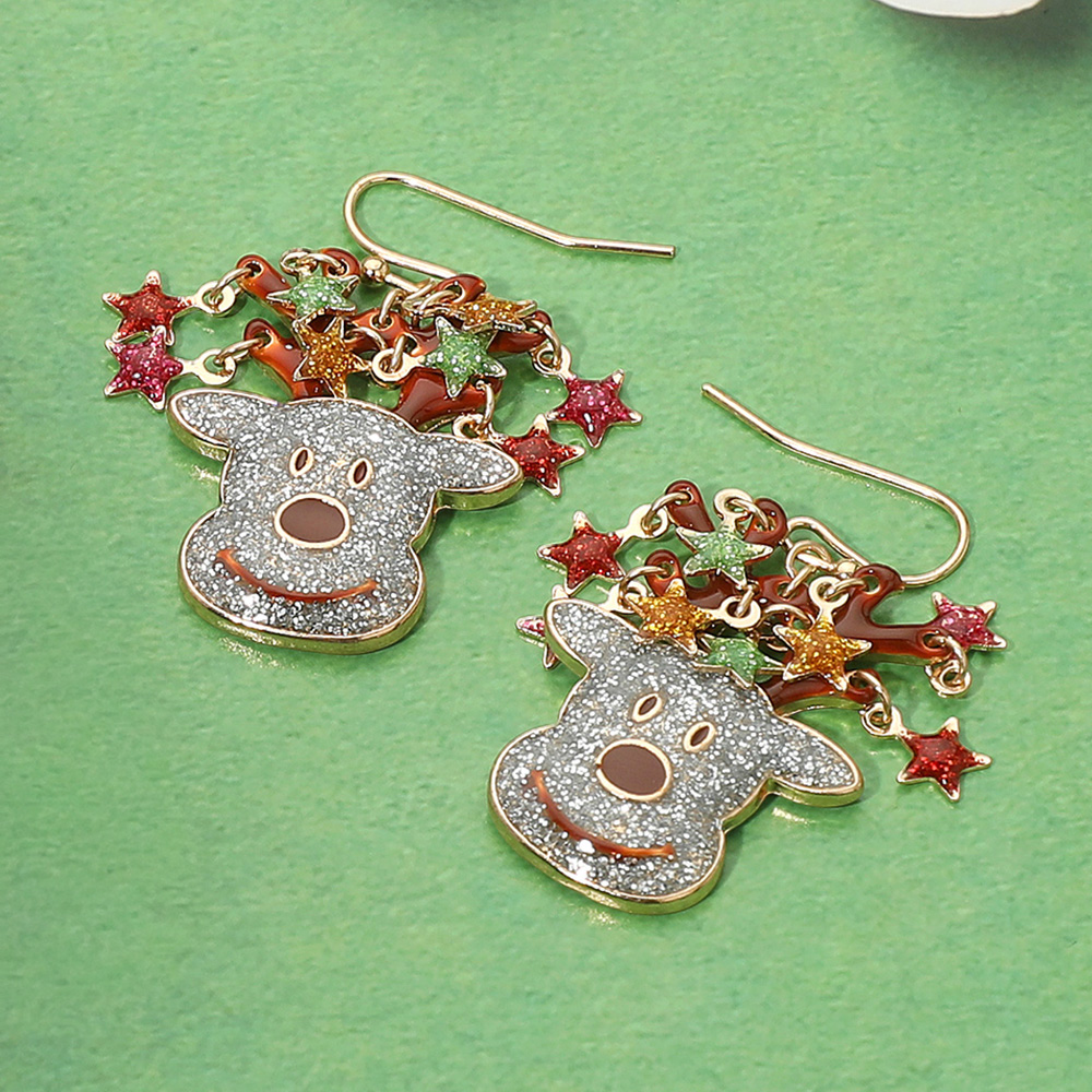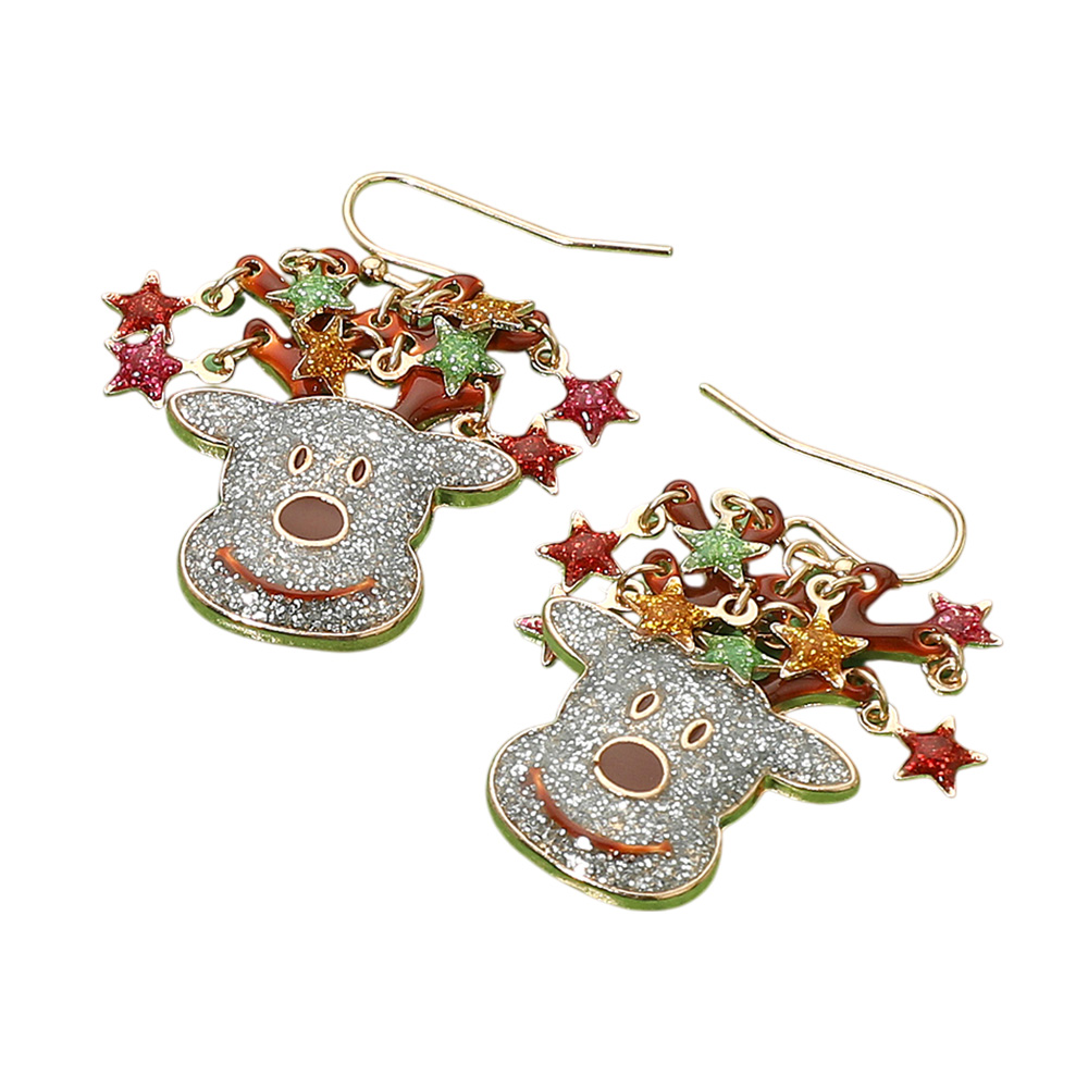 Details • Size : 1" X 1.6" • Fish Hook Back • Celebrate the holidays with these glitter reindeer earrings featuring sparkling antlers adorned with colorful stars. Playful and full of cheer, they’re the perfect accessory to brighten your festive outfits for parties, gatherings, and joyful seasonal events. • Lead and Nickel Compliant