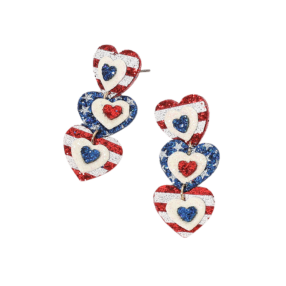 Glittered American USA Flag Triple Heart Link Drop Earrings