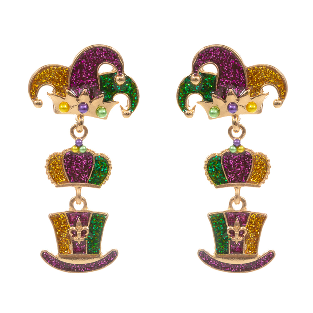Details • Size : 0.9" X 1.8" • Titanium Post Back • Celebrate Mardi Gras with these fun dangle earrings featuring a whimsical jester hat and stacked festive accents. Lightweight and eye-catching, they add a playful touch to party outfits, parade looks, and themed celebrations. Perfect for standout festive style. • Lead and Nickel Compliant • Hypoallergenic