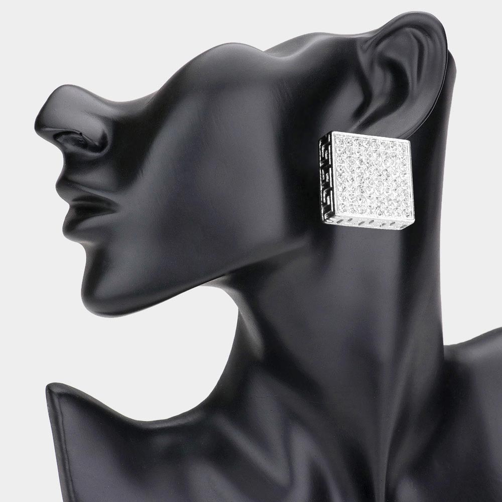 Details • Size : 1.2" X 1.2" • Post Back • Modern square stud earrings adorned with sparkling accents for a bold and elegant look. Their geometric design makes them perfect for both casual and formal outfits, offering a chic statement style that pairs seamlessly with dresses, blazers, or everyday wear for standout sophistication. • Lead and Nickel Compliant