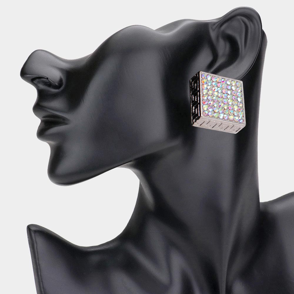 Details • Size : 1.2" X 1.2" • Post Back • Modern square stud earrings adorned with sparkling accents for a bold and elegant look. Their geometric design makes them perfect for both casual and formal outfits, offering a chic statement style that pairs seamlessly with dresses, blazers, or everyday wear for standout sophistication. • Lead and Nickel Compliant