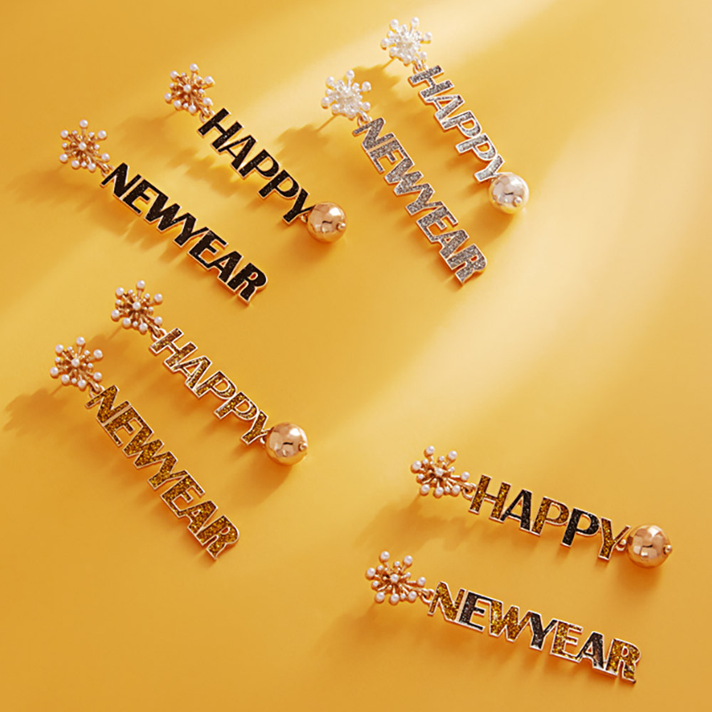 Details • Size : 0.5" X 2.5" • Titanium Post Back • Celebrate in style with these glitter letter drop earrings featuring festive “HAPPY” and “NEW YEAR” designs. Sparkling accents and playful dangles make them the perfect statement accessory for parties and celebrations, adding fun and glamour to every festive outfit. • Hypoallergenic • Lead and Nickel Compliant