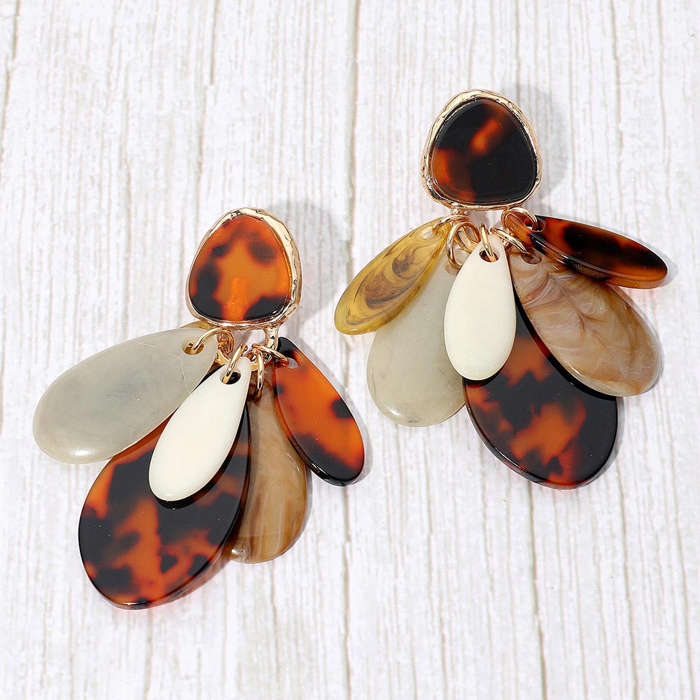 Details • Size : 1.75" X 3.25" • Post Back • Make a bold style impact with these statement resin drop earrings featuring layered teardrop accents in a mix of sleek, sculpted finishes. Their artistic, dimensional design adds movement and sophistication, creating a standout accessory perfect for elevating both casual and dressy looks. • Lead and Nickel Compliant