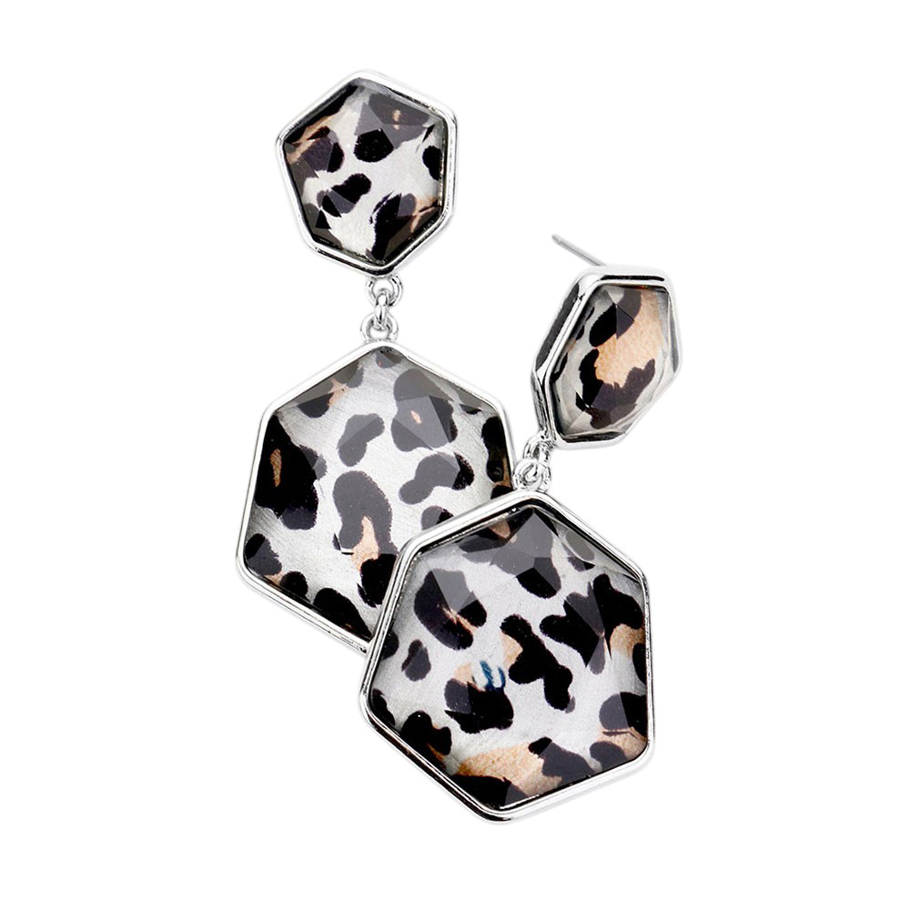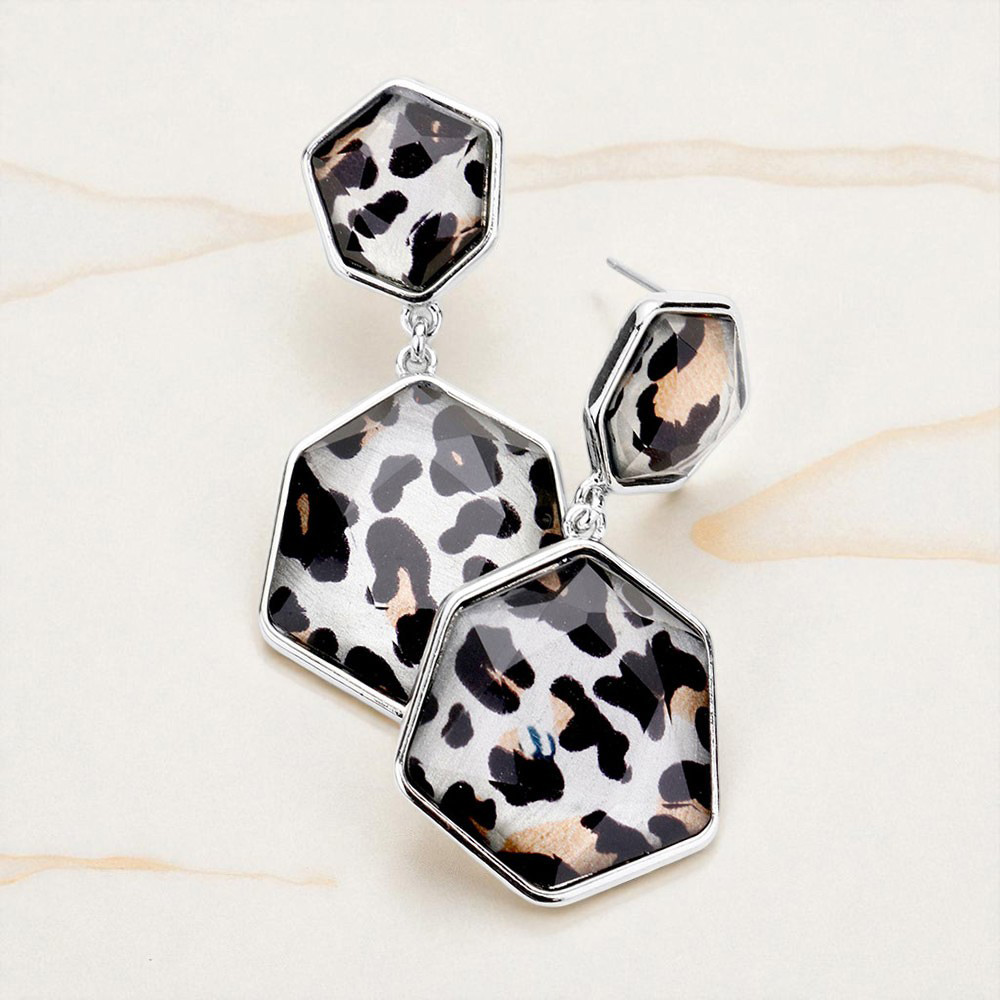 Glitter Leopard Double Hexagon Bead Link Earrings