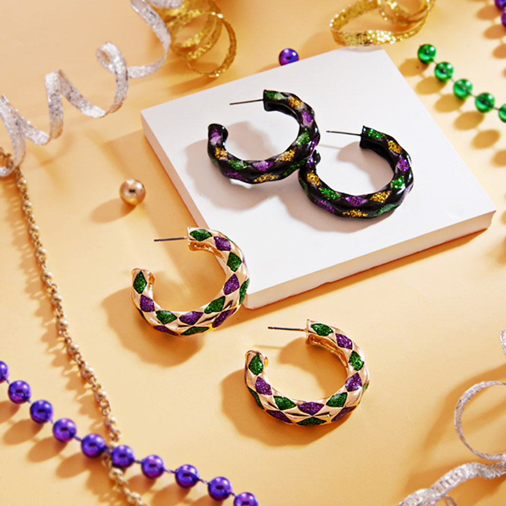 Details • Size : 1.25" L • Titanium Post Back • Diamond pattern hoop earrings perfect for festivals, parades, and party outfits. Lightweight and bold, these hoops add a playful touch to costume themes and celebration looks. Ideal for completing festive accessories. • Lead and Nickel Compliant