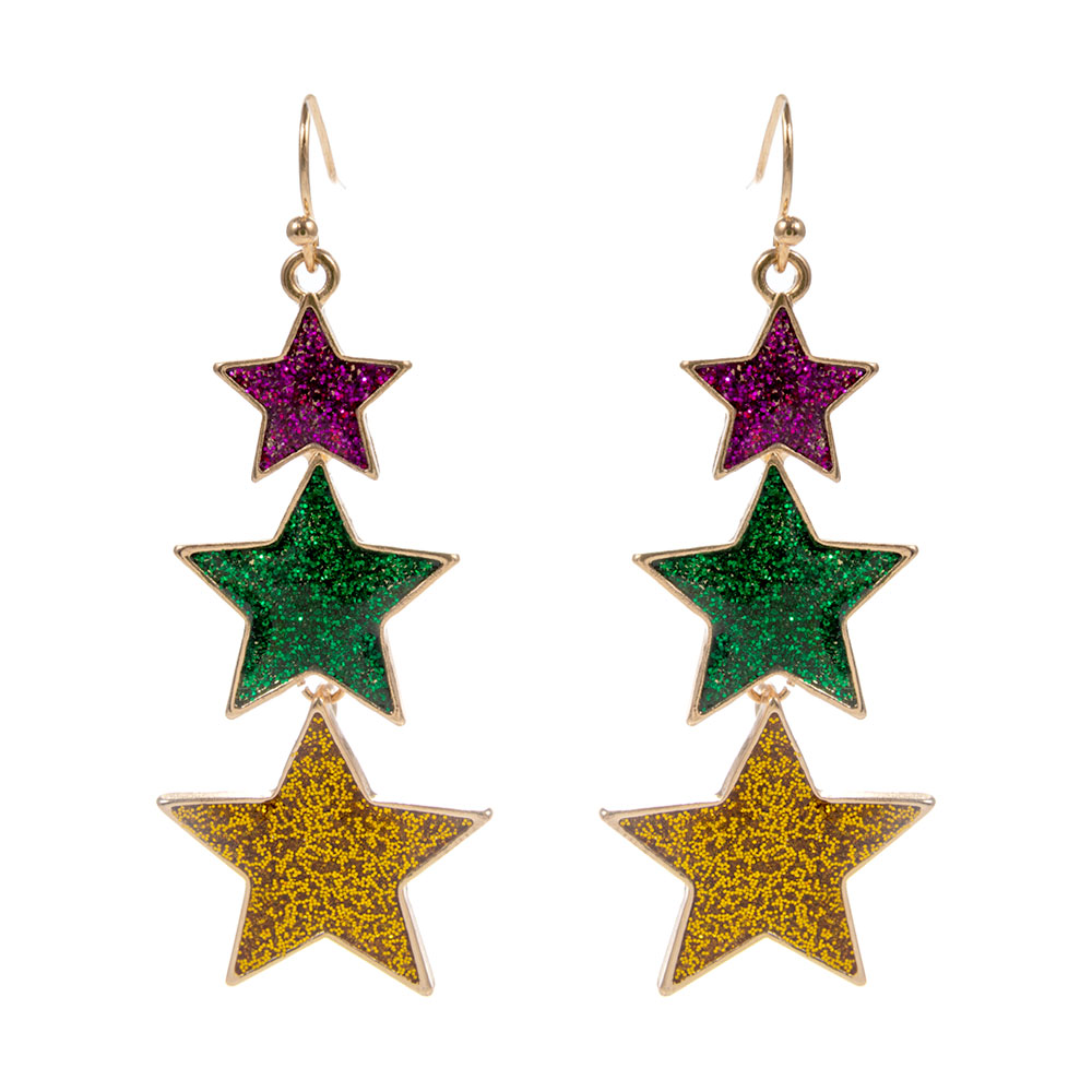 Details • Size : 0.9" X 2.4" • Brass Fish Hook Back • Shine bright at any celebration with these triple glitter star drop earrings. Featuring a cascading star design that sparkles with festive charm, they bring a fun and glamorous touch to parties, parades, and special occasions, perfect for standing out with bold style. • Lead and Nickel Compliant • Brass