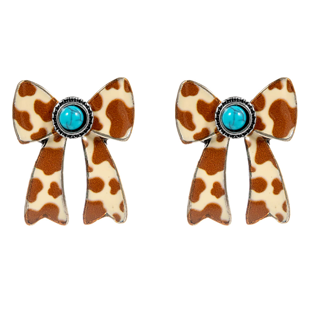 Oval Turquoise Stone Center Animal Pattern Print Western Bow Earrings