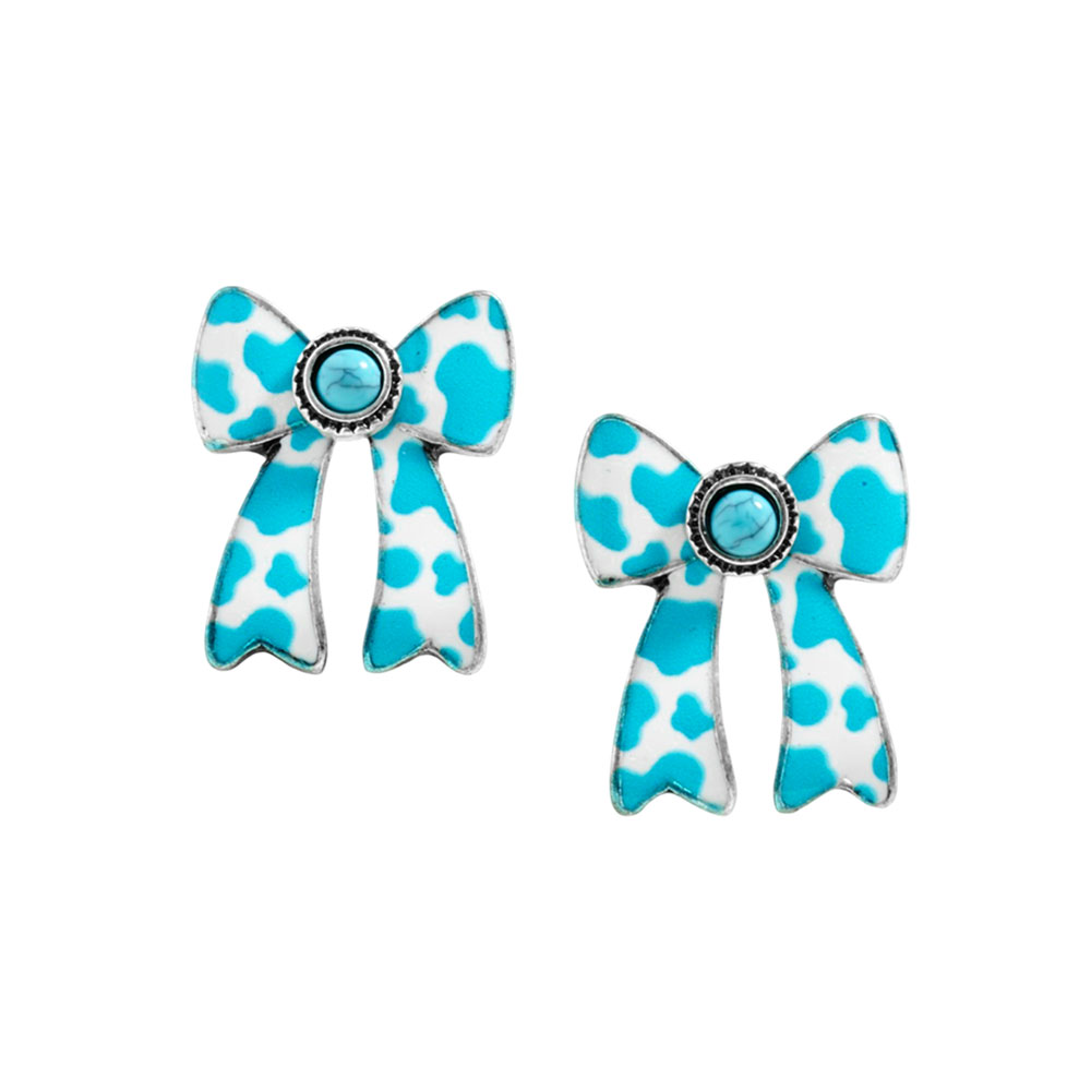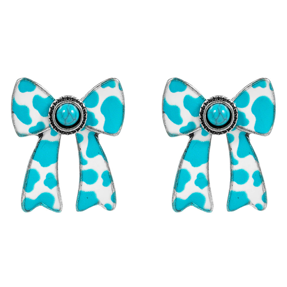 Oval Turquoise Stone Center Animal Pattern Print Western Bow Earrings