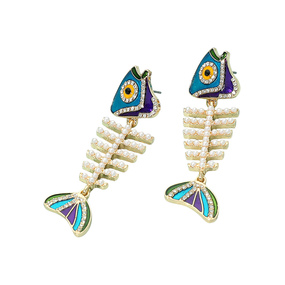 Details • Size : 0.8" X 2.75" • Post Back • Playful fish skeleton statement earrings featuring bold enamel details, sparkling accents, and a unique ocean-inspired design. Perfect for adding a whimsical nautical touch to summer outfits, beach parties, or casual looks. Eye-catching accessory for those who love fun and creative jewelry. • Lead and Nickel Compliant
