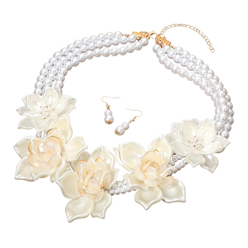 Details • Necklace Size : 21" + 4" L • Decor Size : 3" L • Earrings Size : 1.5" L • An elegant statement necklace set with layered floral accents and coordinating earrings, featuring an adjustable fit for comfortable wear. Perfect for weddings, parties, formal events, and special occasions, adding graceful charm and standout style to any outfit. • Lead and Nickel Compliant