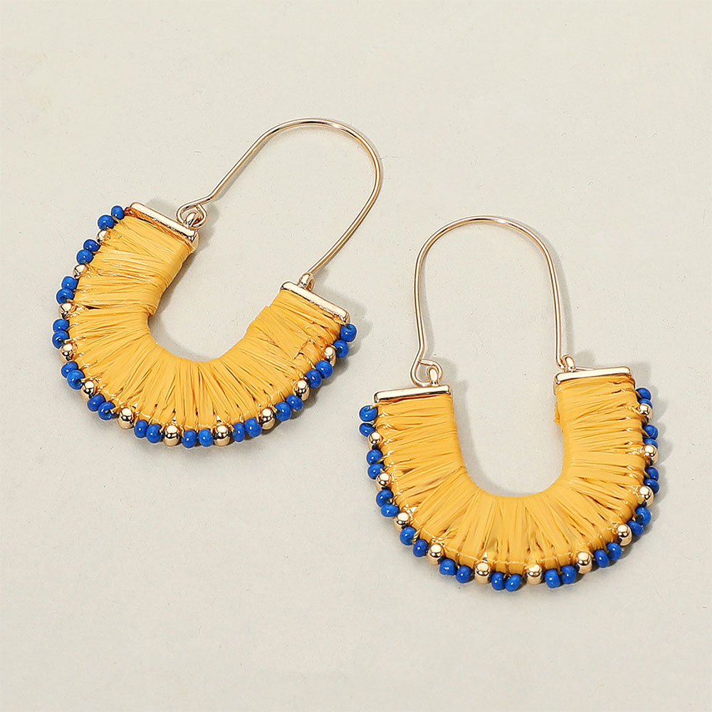 Details • Size : 1.3" X 2" • Kidney Wire Closure • Add playful elegance to your look with raffia wrapped hoop earrings accented by a beaded trim. Bold yet lightweight, these unique earrings blend vibrant texture with modern style, making them a standout accessory for casual outfits, vacations, or festive occasions. • Lead and Nickel Compliant