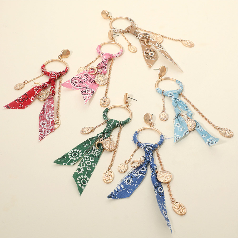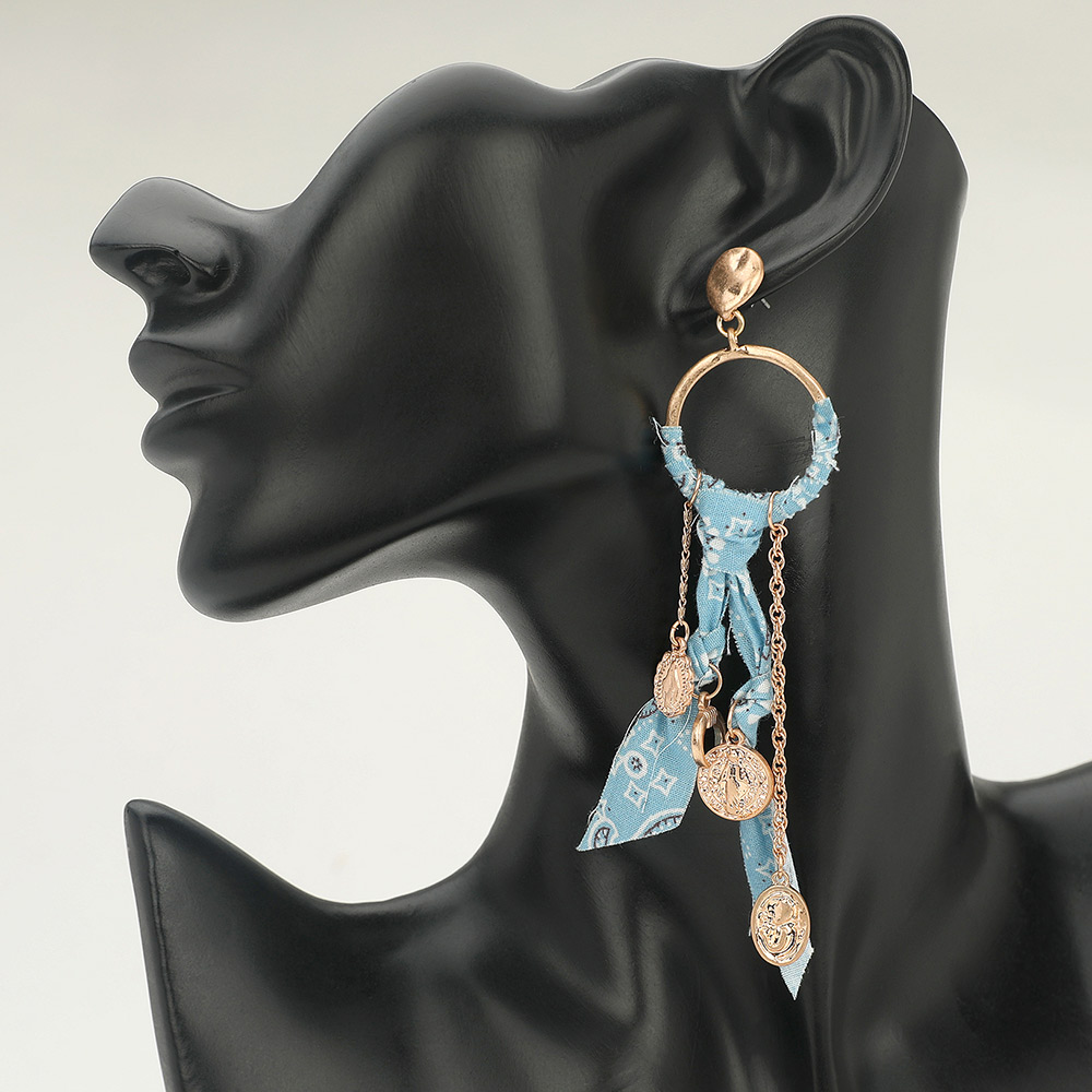 • Bold and stylish statement drop earrings featuring a fabric-wrapped hoop, cascading chains, and detailed coin charms. Perfect for adding an edgy, bohemian-inspired touch to casual outfits or dressing up evening looks, these earrings bring unique flair and chic elegance.