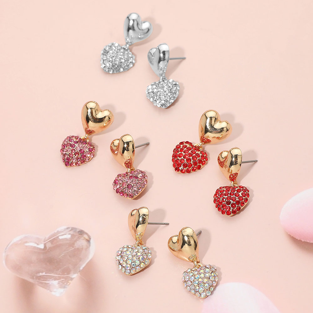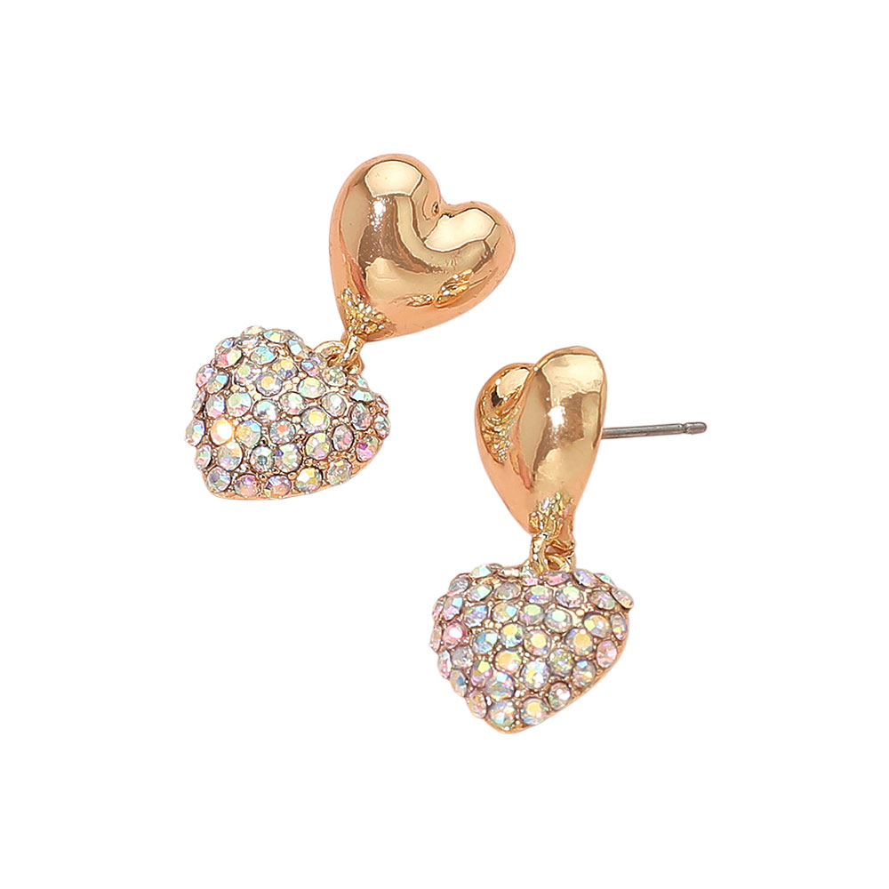 Details • Size : 0.5" X 1.2" • Post Back • Add a touch of romance with these sparkling double heart earrings, featuring a sleek metallic top heart and a dazzling crystal-accented lower heart. Perfect for day-to-night wear, they bring elegant charm and a playful shimmer to your style effortlessly. • Lead and Nickel Compliant