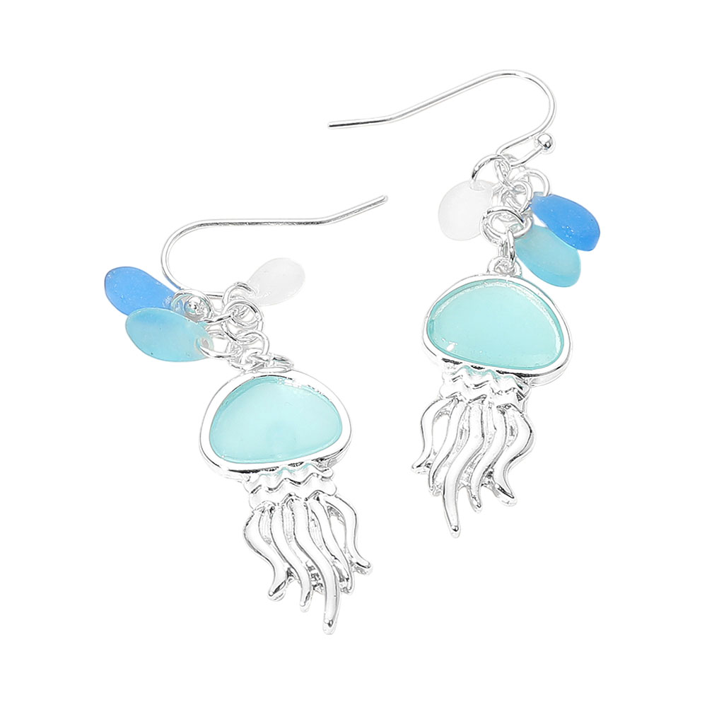 Details • Size : 0.6" X 2" • Fish Hook Back • Jellyfish dangle earrings featuring a playful ocean inspired silhouette with flowing charm details that add movement and visual interest. A fun novelty style ideal for summer collections, beach boutiques, resort gift shops, and coastal themed assortments, perfect for customers drawn to whimsical sea life designs. • Lead and Nickel Compliant