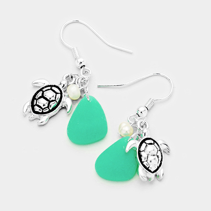 Sea Glass Metal Turtle Pearl Dangle Earrings