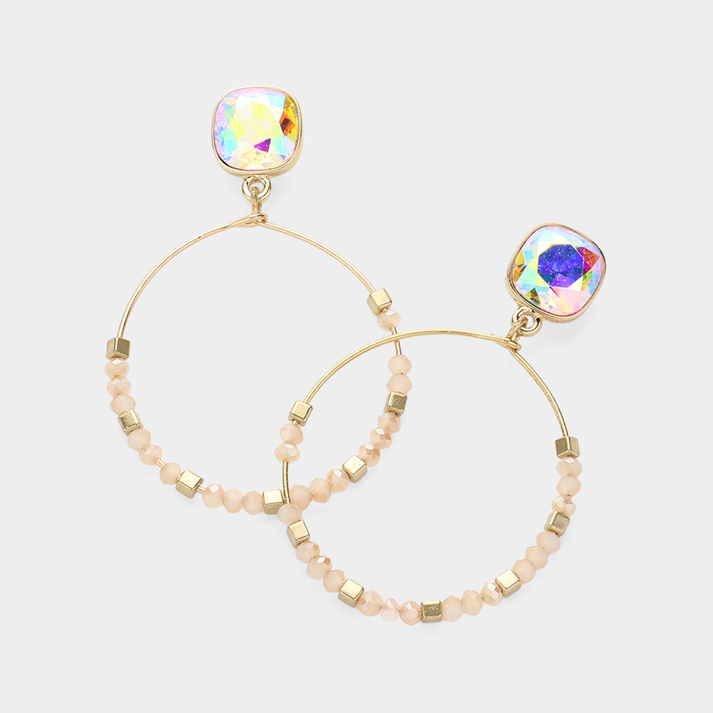 Square Glass Stone Pointed Faceted Beaded Open Circle Dangle Earrings