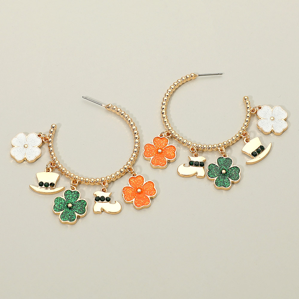 Details • Size : 2" X 2.4" • Post Back • Festive charm hoop earrings inspired by St. Patrick’s Day, featuring playful themed icons that add movement and personality. Designed to stand out at parades, parties, and seasonal events while complementing holiday outfits. A fun statement accessory for themed collections, gifting, and retail displays. • Lead and Nickel Compliant