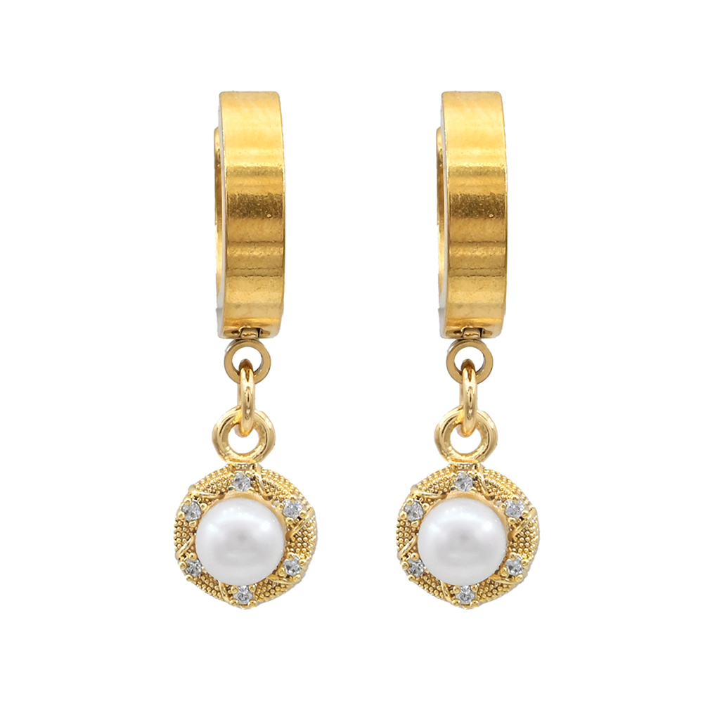Stainless Steel CZ Stone Rim Pearl Charm Dangle Huggie Earrings