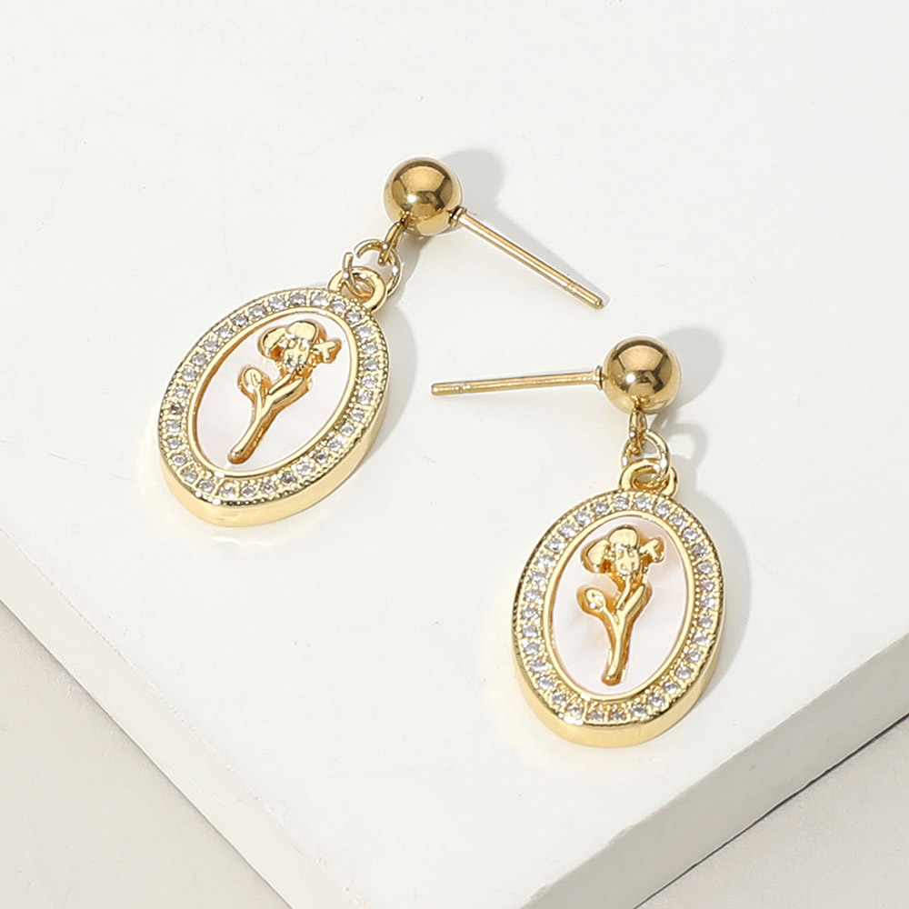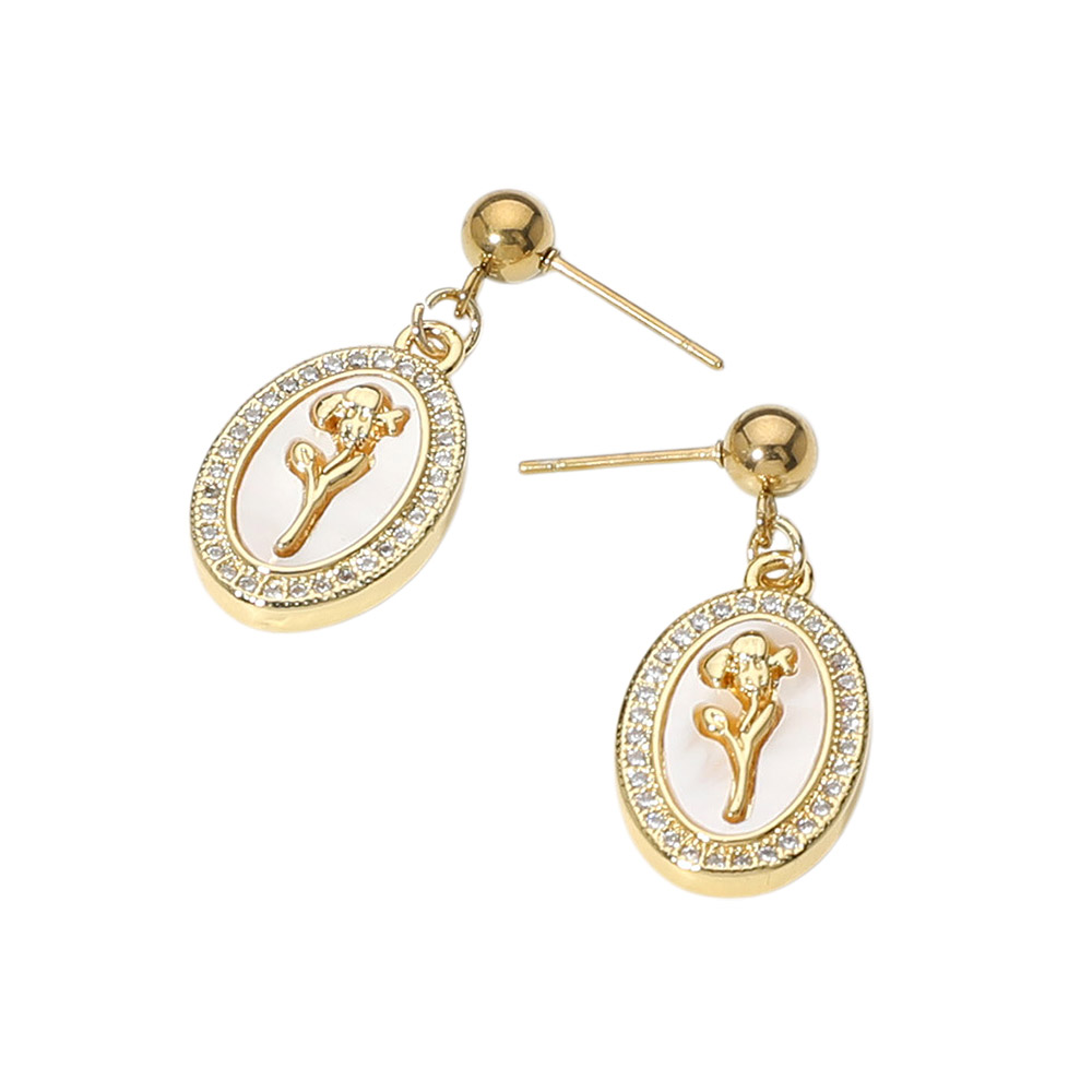 Stainless Steel Stone Paved Tulip Flower Embossed Mother of Pearl Oval Dangle Earrings
