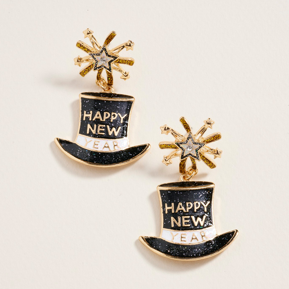 Details • Size : 1.25" X 1.8" • Titanium Post Back • Celebrate in style with these Happy New Year dangle earrings featuring sparkling starburst studs and festive top hat drops. Perfect for parties, countdown events, and holiday gatherings, these statement earrings add fun, cheer, and sparkle to your celebration look. • Hypoallergenic • Lead and Nickel Compliant