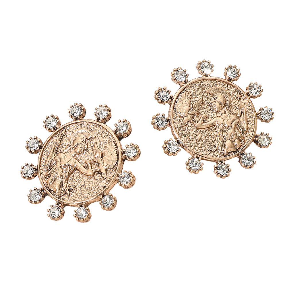 Details • Size : 1.3" X 1.3" • Post Back • Bring a touch of vintage glamour to your look with these Embellished Coin Stud Earrings. Designed with a detailed coin centerpiece framed by sparkling accents, these earrings blend classic artistry with modern elegance—perfect for adding sophistication to any outfit. • Lead and Nickel Compliant