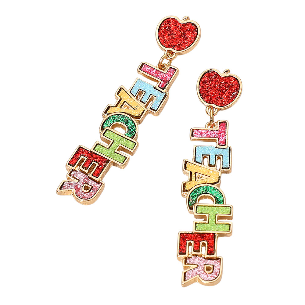 Details • Size : 0.4" X 2" • Post Back • Playful vertical letter drops spelling “TEACHER,” topped with apple accents for a fun, classroom-ready statement. Perfect for spirit days, teacher appreciation gifts, school events, or everyday outfits that celebrate education in style. • Lead and Nickel Compliant