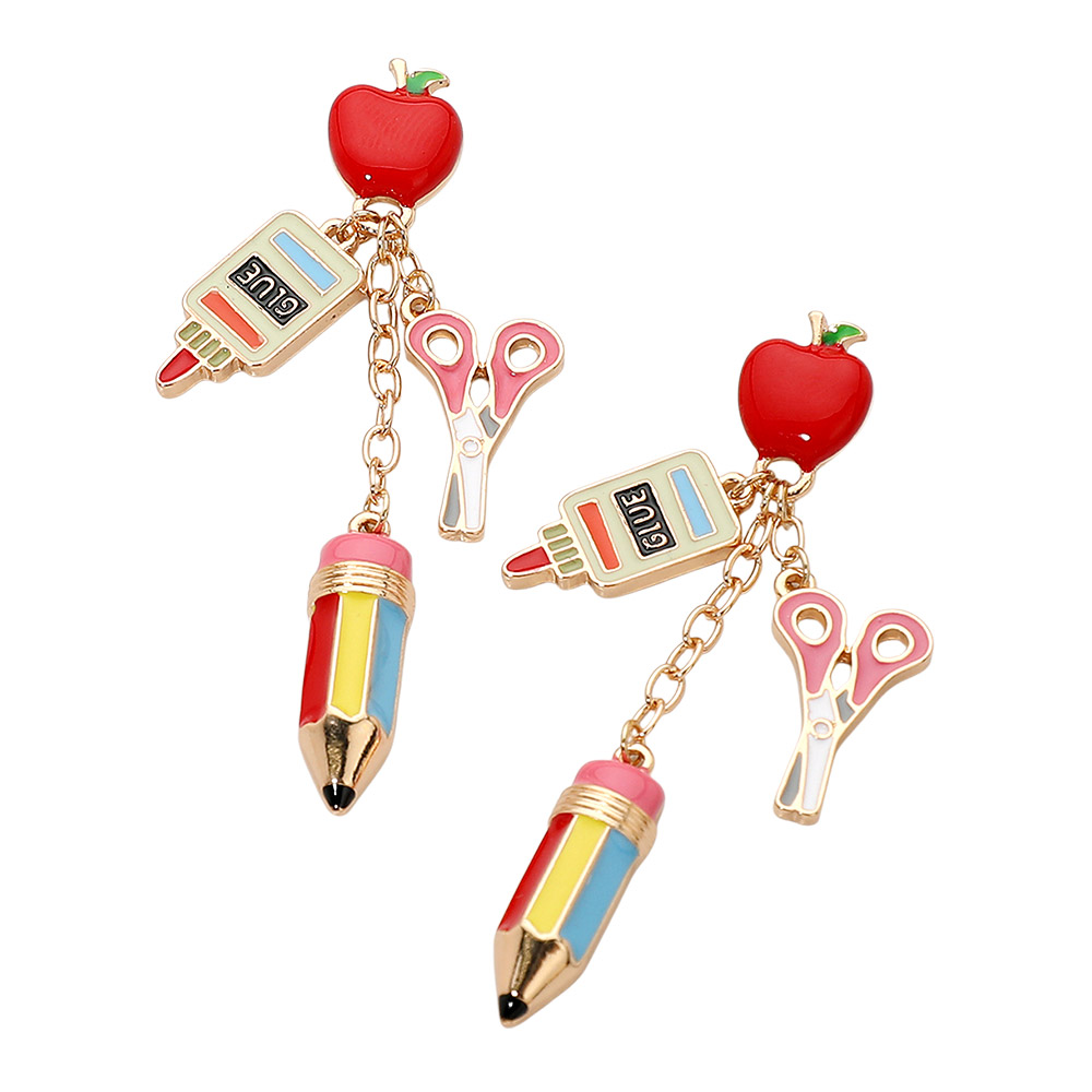 • Whimsical drop earrings featuring playful school-themed charms including pencil, scissors, glue, and apple accents. Designed to add personality and fun to everyday outfits, these novelty earrings are ideal for teachers, back-to-school displays, classroom-inspired collections, and gift-ready assortments.