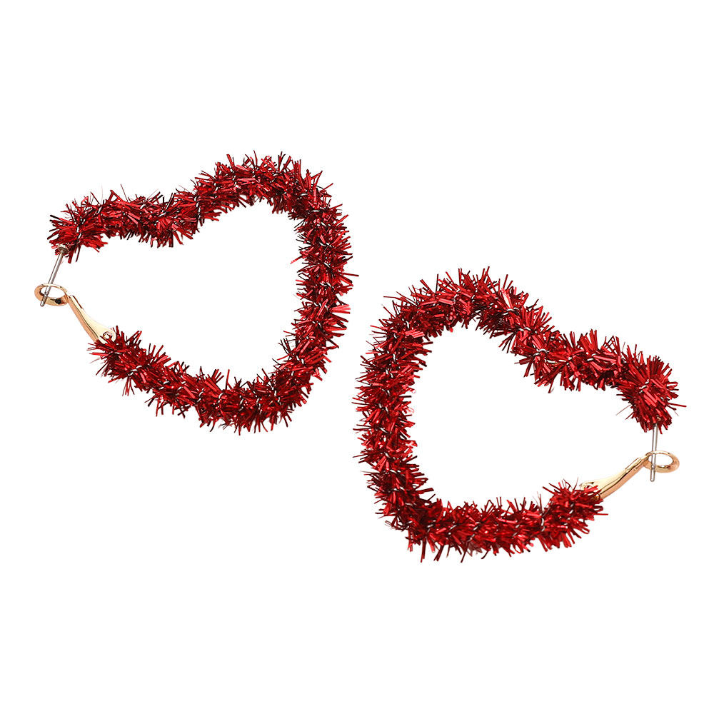 • Make a bold and playful statement with these heart-shaped hoop earrings featuring a festive tinsel texture. Lightweight and full of charm, they add sparkle and fun to any outfit. Perfect for parties, themed events, or when you want to showcase your vibrant, confident style.